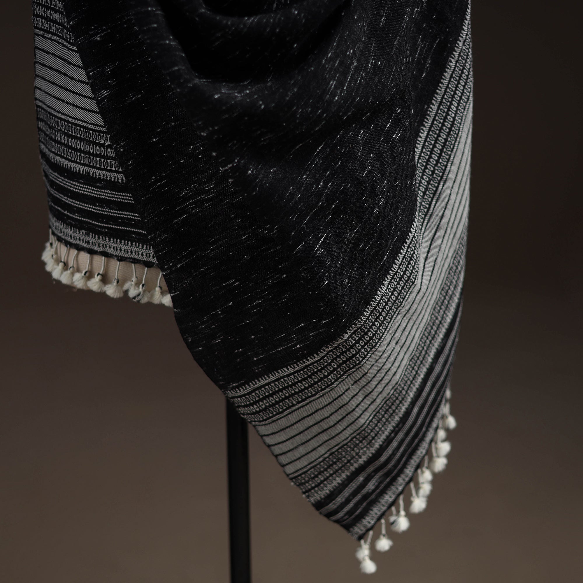 Bhujodi shawl handwoven by Vinay Siju in Bhuj, Gujarat. Designed with traditional Kutchi motifs and tassels. Made from merino wool to provide reliable warmth. A practical choice for everyday winter wear or outings.