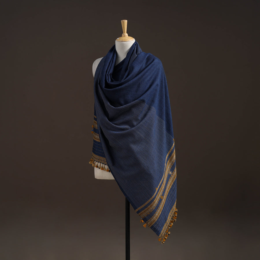 Bhujodi shawl handwoven by Vinay Siju in Bhuj, Gujarat. Designed with traditional Kutchi motifs and tassels. Made from merino wool to provide reliable warmth. A practical choice for everyday winter wear or outings.