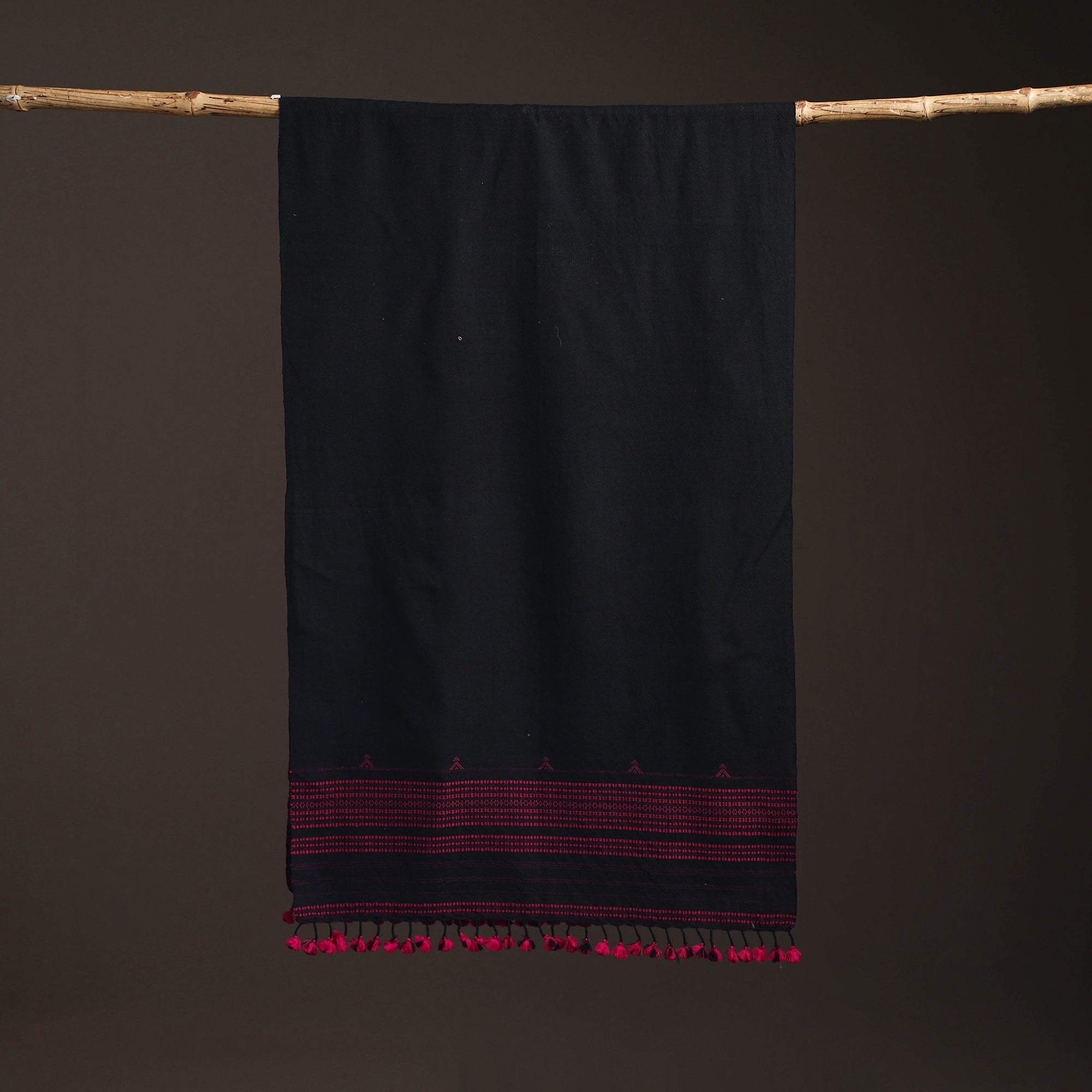 Black bhujodi stole handwoven by Vinay Siju in Bhuj, Gujarat. Designed with traditional Kutchi motifs and tassels. Made from merino wool to provide reliable warmth. A practical choice for everyday winter wear or outings.