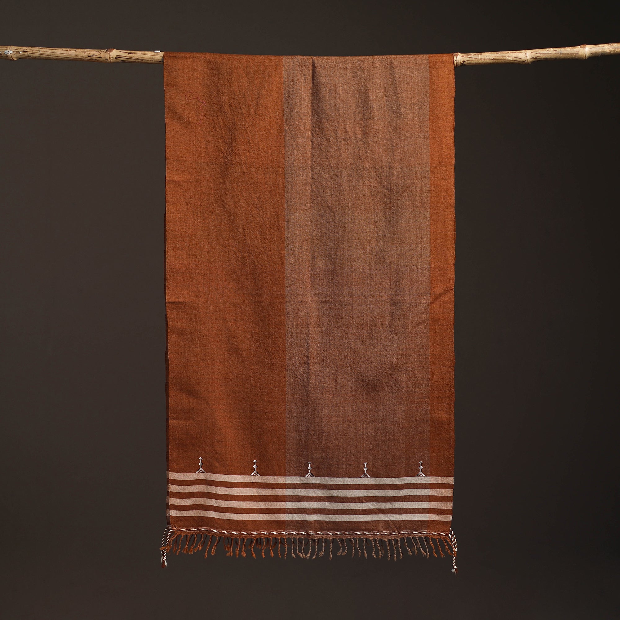 Brown bhujodi stole handwoven by Vinay Siju in Bhuj, Gujarat. Designed with traditional Kutchi motifs and tassels. Made from merino wool to provide reliable warmth. A practical choice for everyday winter wear or outings.