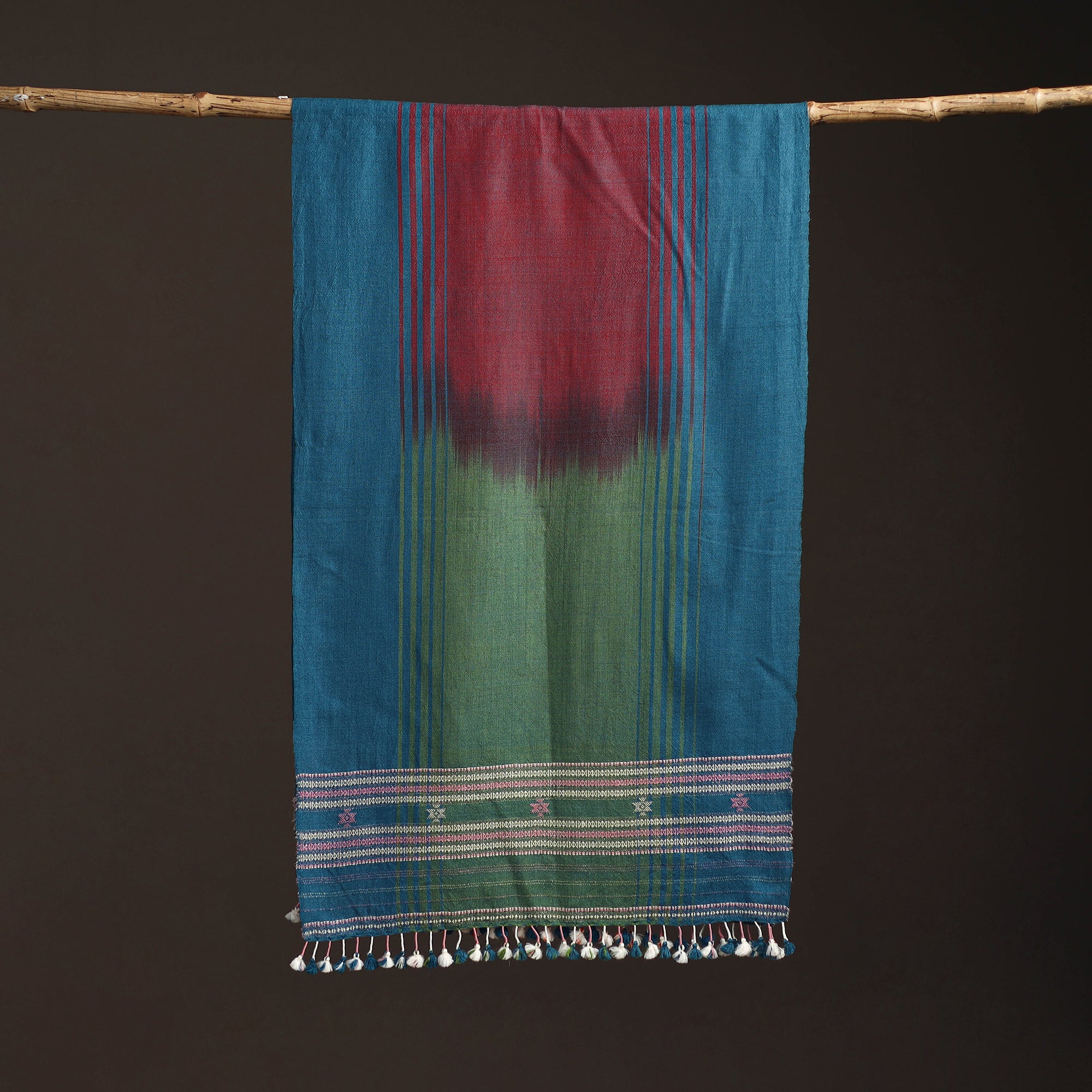 Blue bhujodi stole handwoven by Vinay Siju in Bhuj, Gujarat. Designed with traditional Kutchi motifs and tassels. Made from merino wool to provide reliable warmth. A practical choice for everyday winter wear or outings.