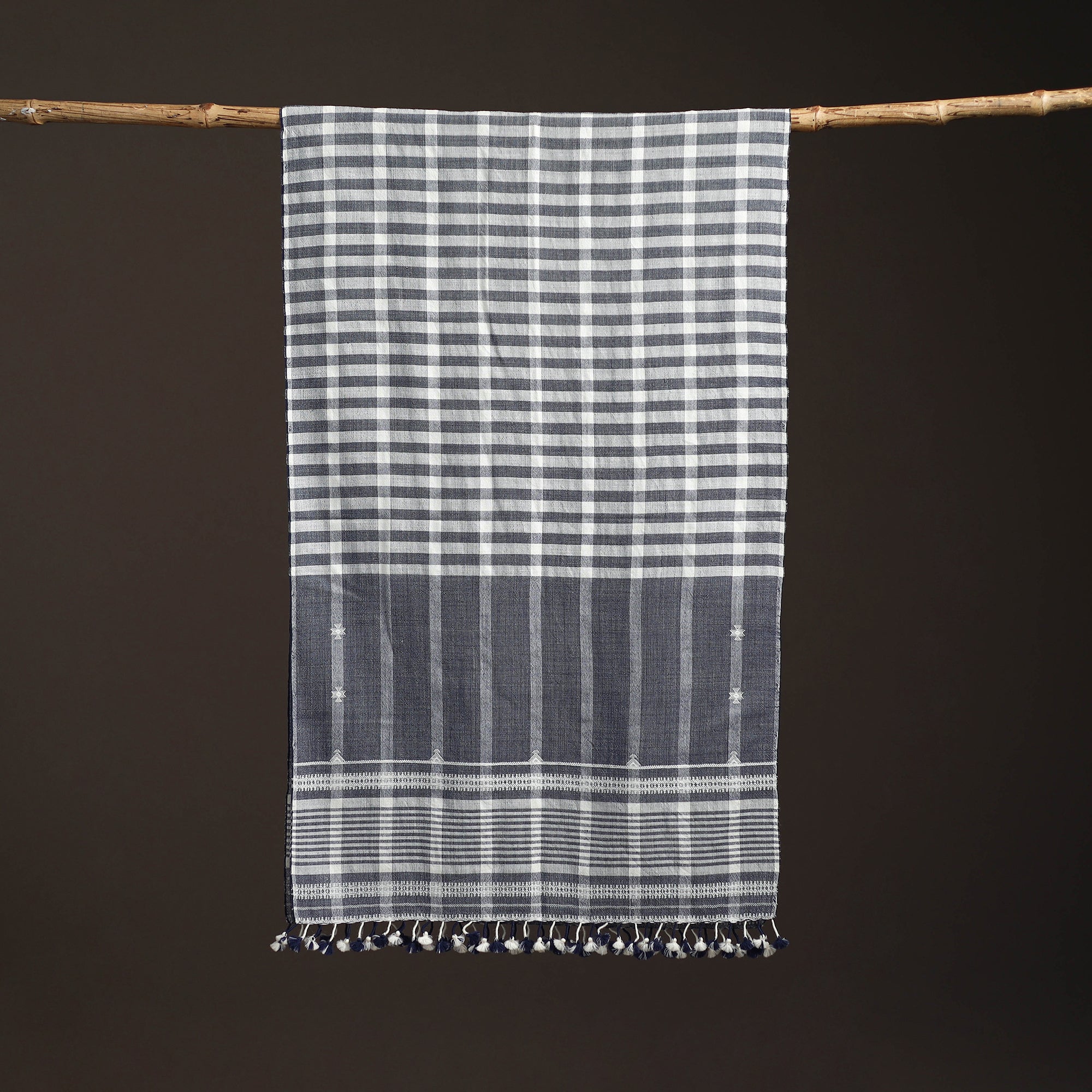 Blue bhujodi stole handwoven by Vinay Siju in Bhuj, Gujarat. Designed with traditional Kutchi motifs and tassels. Made from merino wool to provide reliable warmth. A practical choice for everyday winter wear or outings.