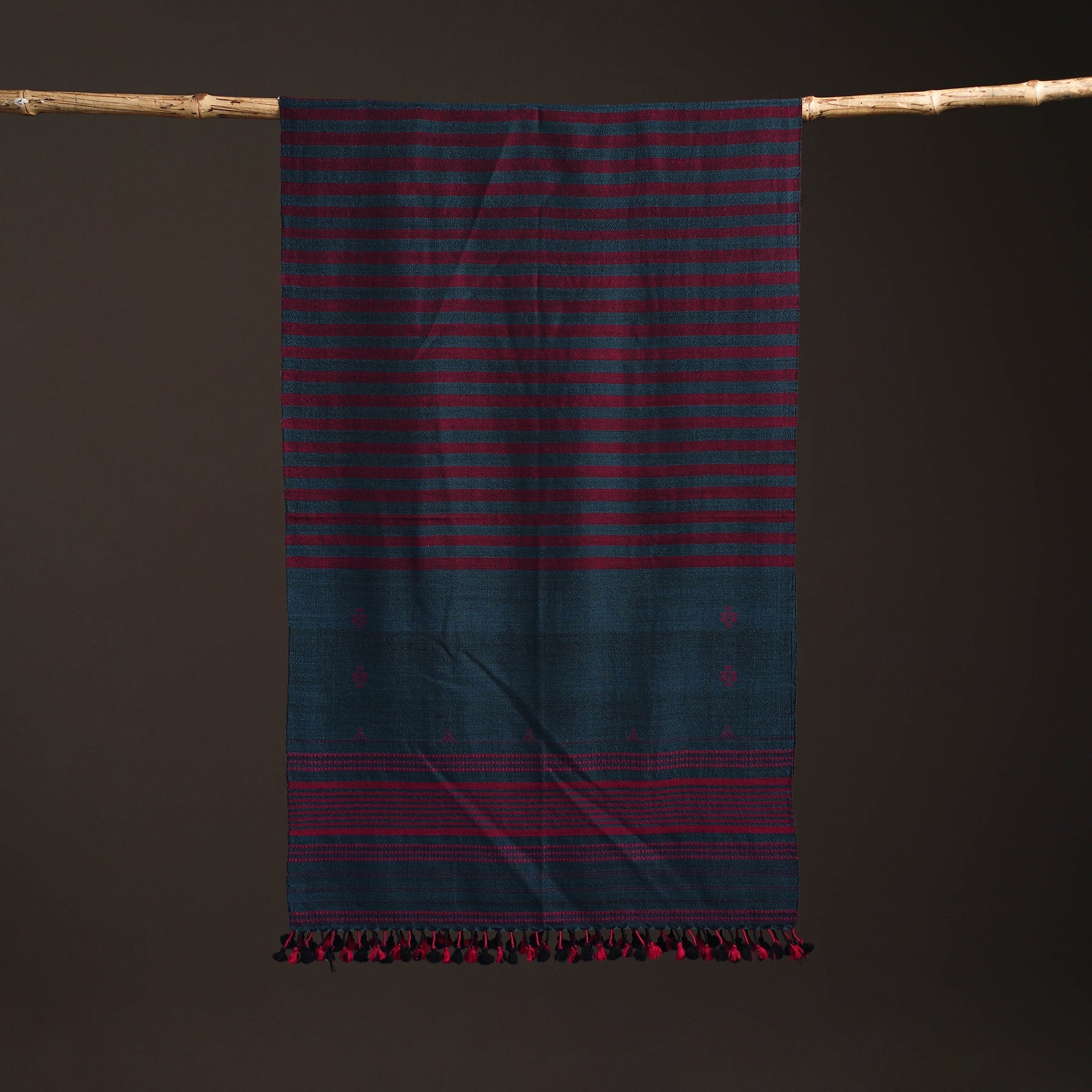 Blue bhujodi stole handwoven by Vinay Siju in Bhuj, Gujarat. Designed with traditional Kutchi motifs and tassels. Made from merino wool to provide reliable warmth. A practical choice for everyday winter wear or outings.