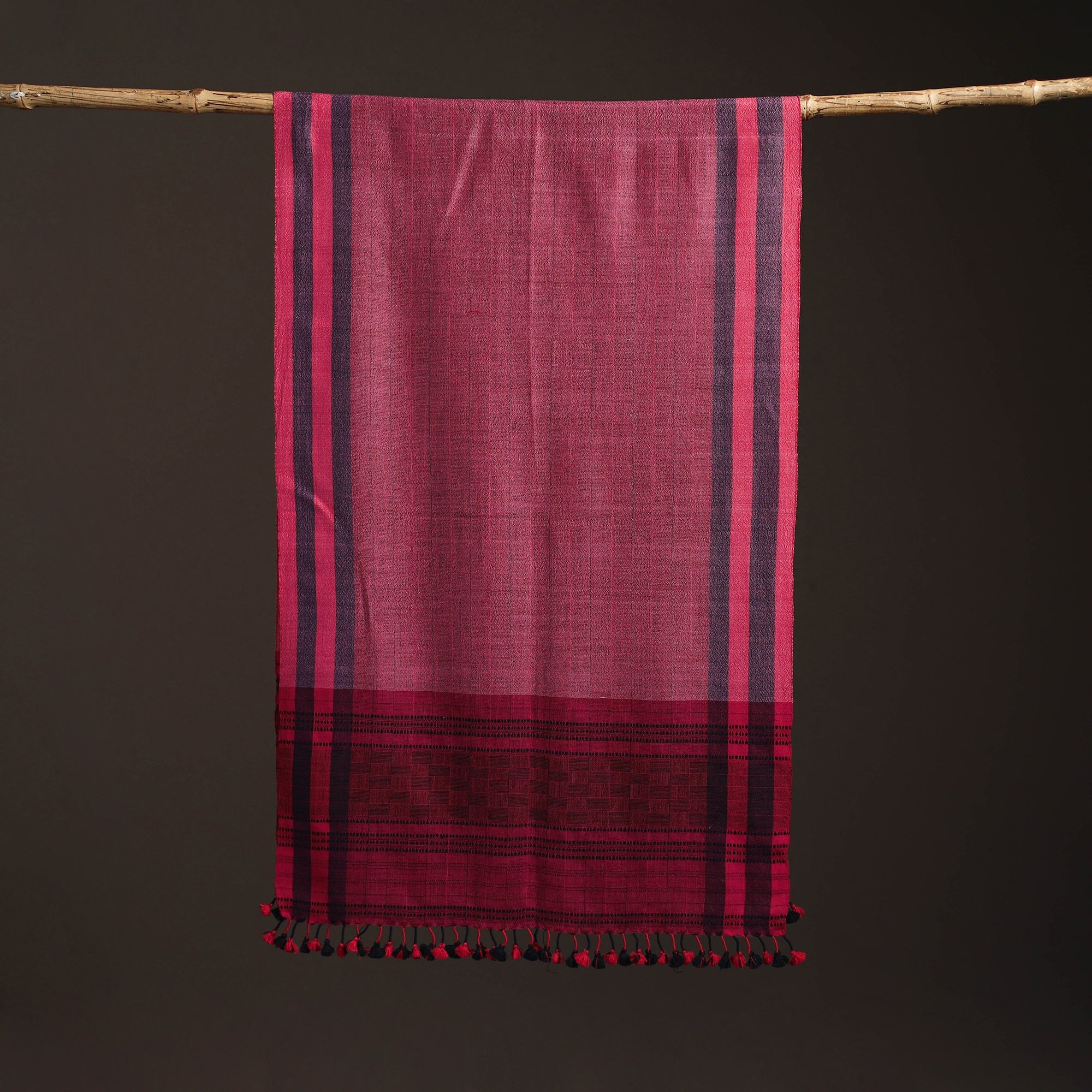 Pink bhujodi stole handwoven by Vinay Siju in Bhuj, Gujarat. Designed with traditional Kutchi motifs and tassels. Made from merino wool to provide reliable warmth. A practical choice for everyday winter wear or outings.