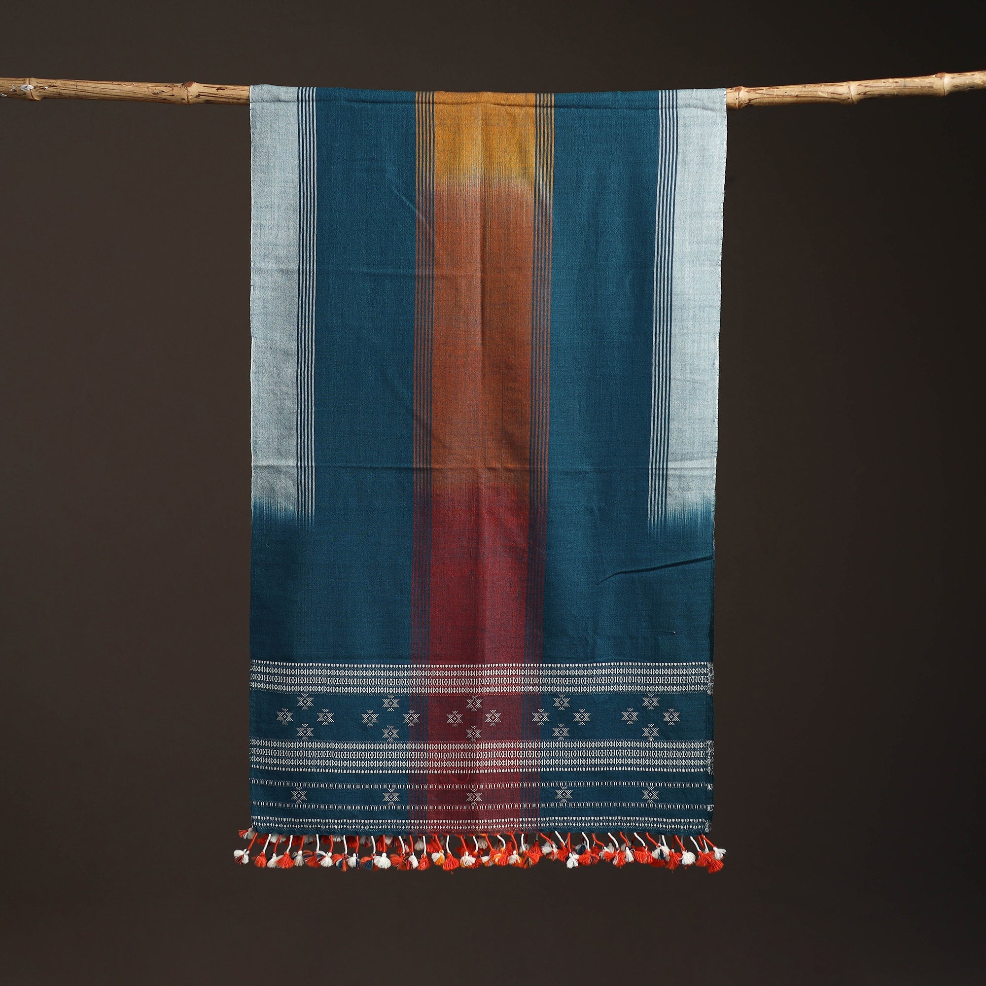Multicolor bhujodi stole handwoven by Vinay Siju in Bhuj, Gujarat. Designed with traditional Kutchi motifs and tassels. Made from merino wool to provide reliable warmth. A practical choice for everyday winter wear or outings.