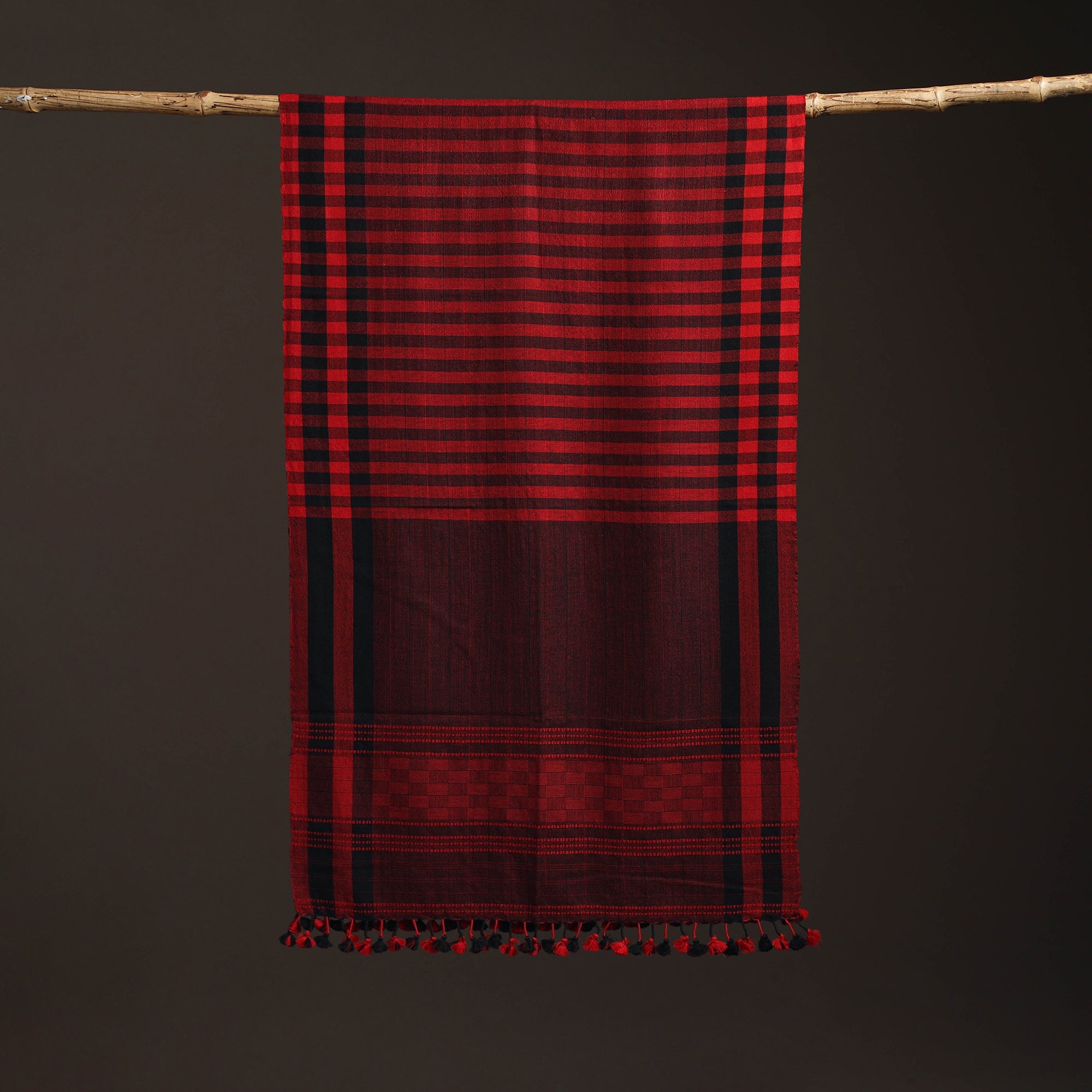 Red bhujodi stole handwoven by Vinay Siju in Bhuj, Gujarat. Designed with traditional Kutchi motifs and tassels. Made from merino wool to provide reliable warmth. A practical choice for everyday winter wear or outings.