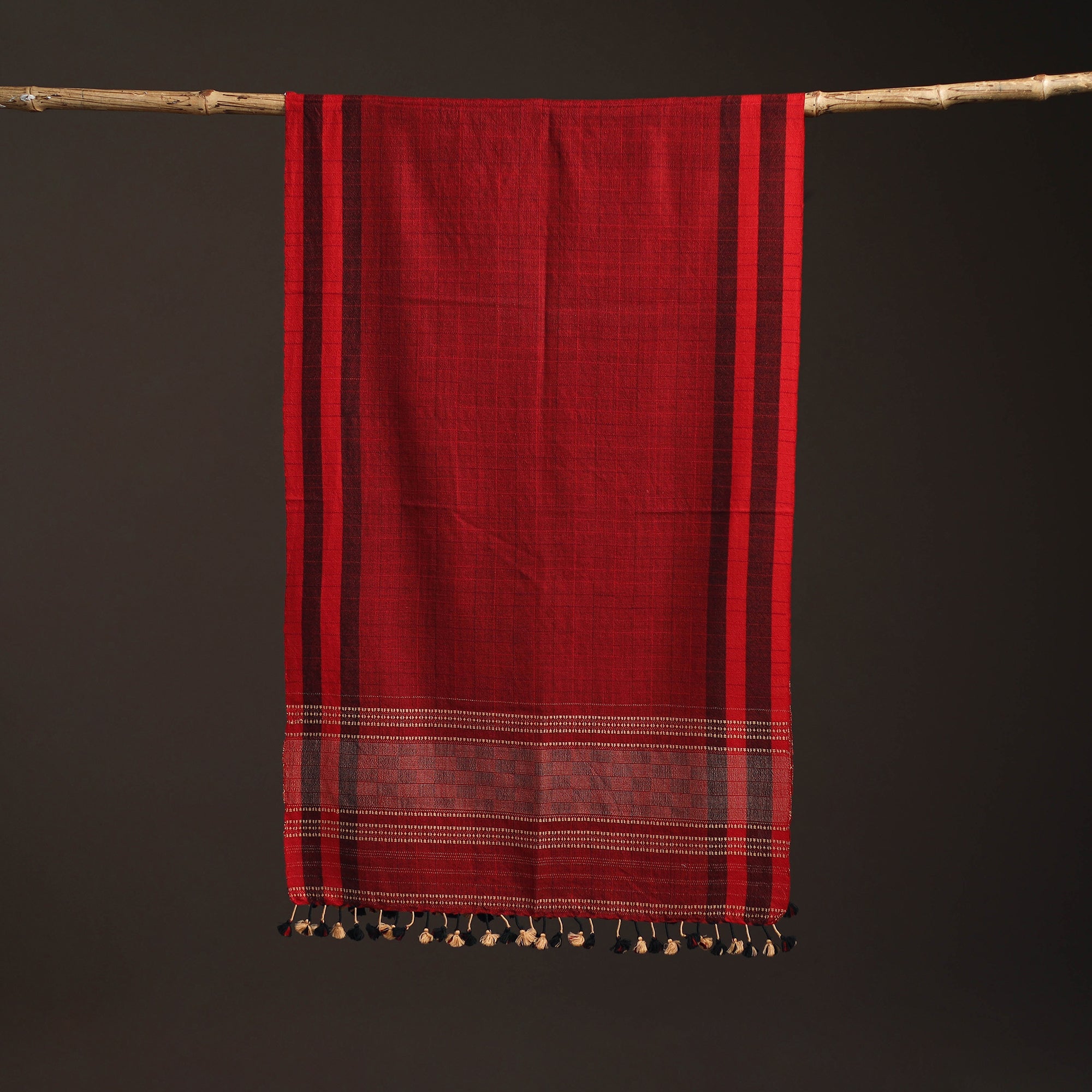 Red bhujodi stole handwoven by Vinay Siju in Bhuj, Gujarat. Designed with traditional Kutchi motifs and tassels. Made from merino wool to provide reliable warmth. A practical choice for everyday winter wear or outings.