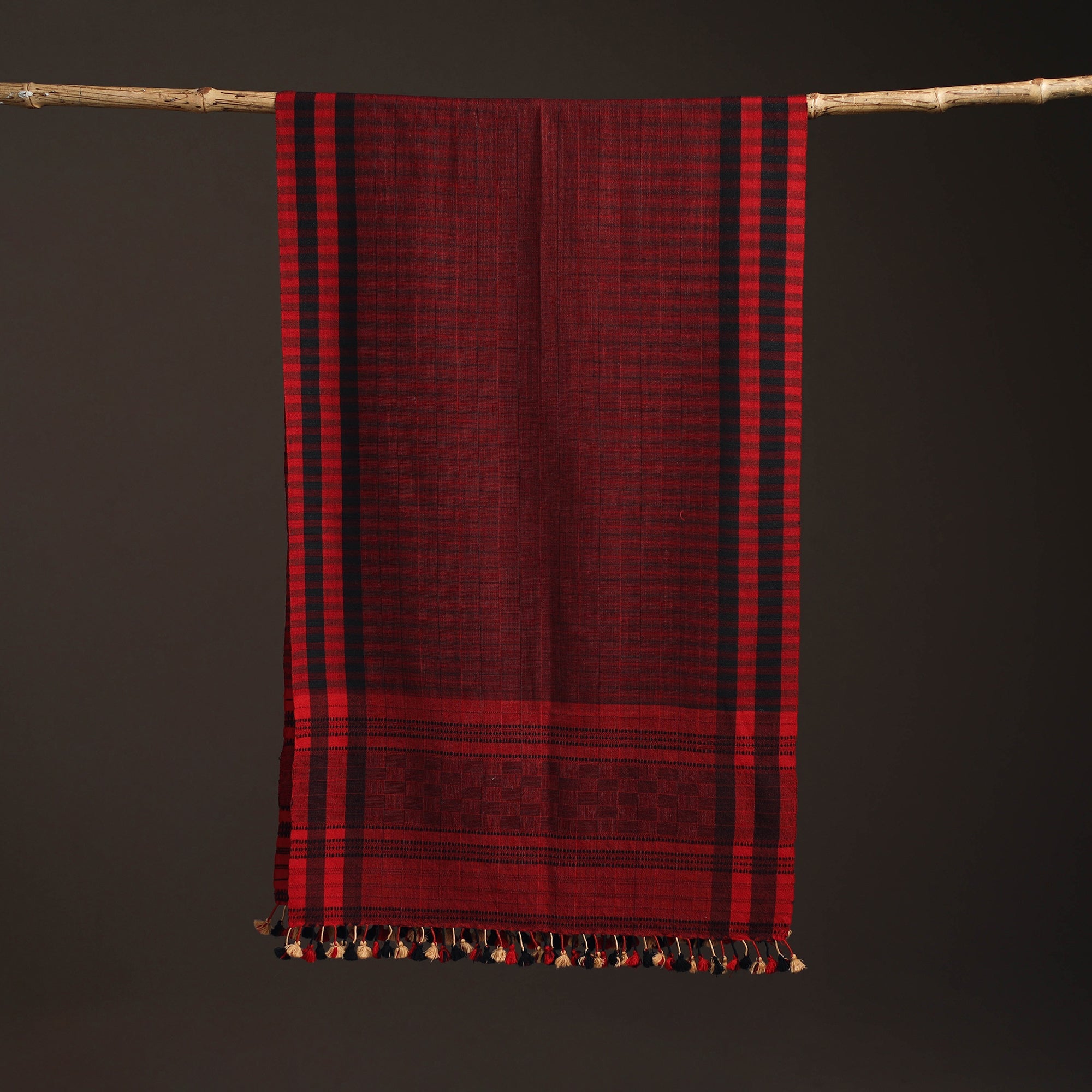 Red bhujodi stole handwoven by Vinay Siju in Bhuj, Gujarat. Designed with traditional Kutchi motifs and tassels. Made from merino wool to provide reliable warmth. A practical choice for everyday winter wear or outings.