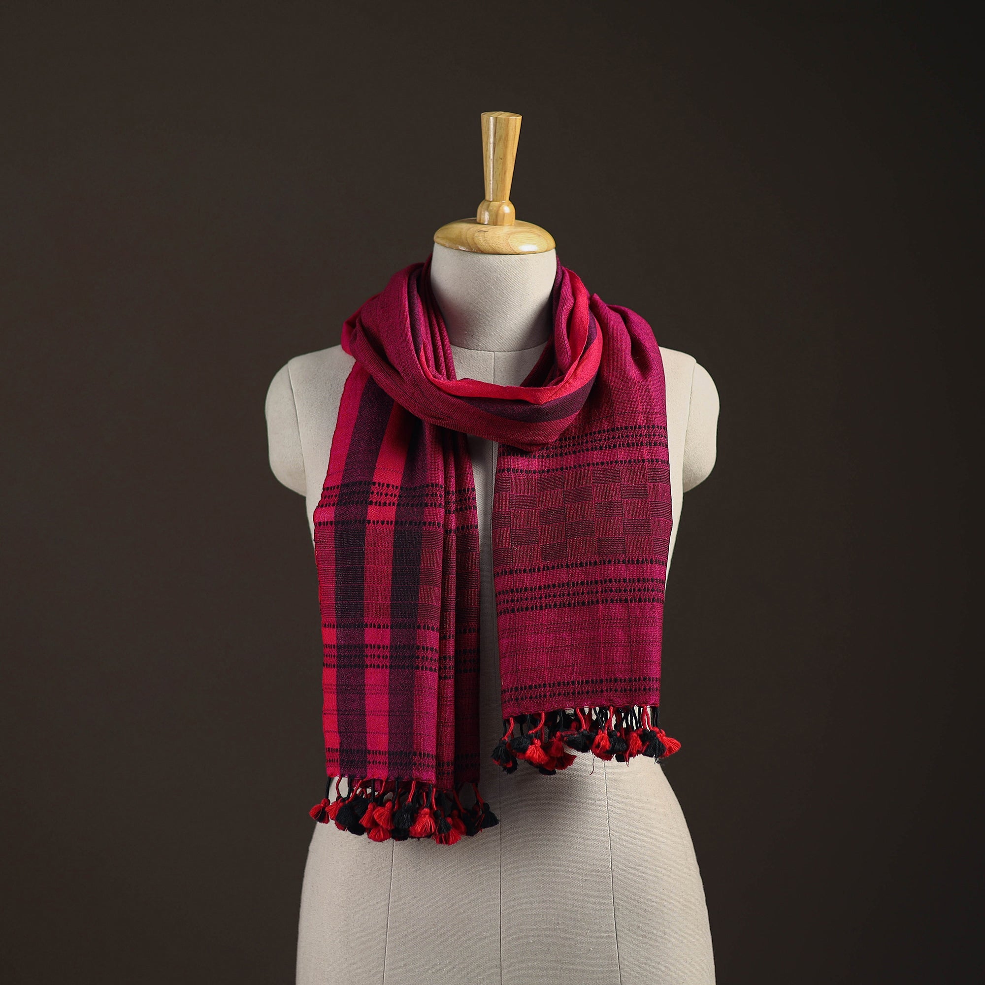 Pink bhujodi stole handwoven by Vinay Siju in Bhuj, Gujarat. Designed with traditional Kutchi motifs and tassels. Made from merino wool to provide reliable warmth. A practical choice for everyday winter wear or outings.