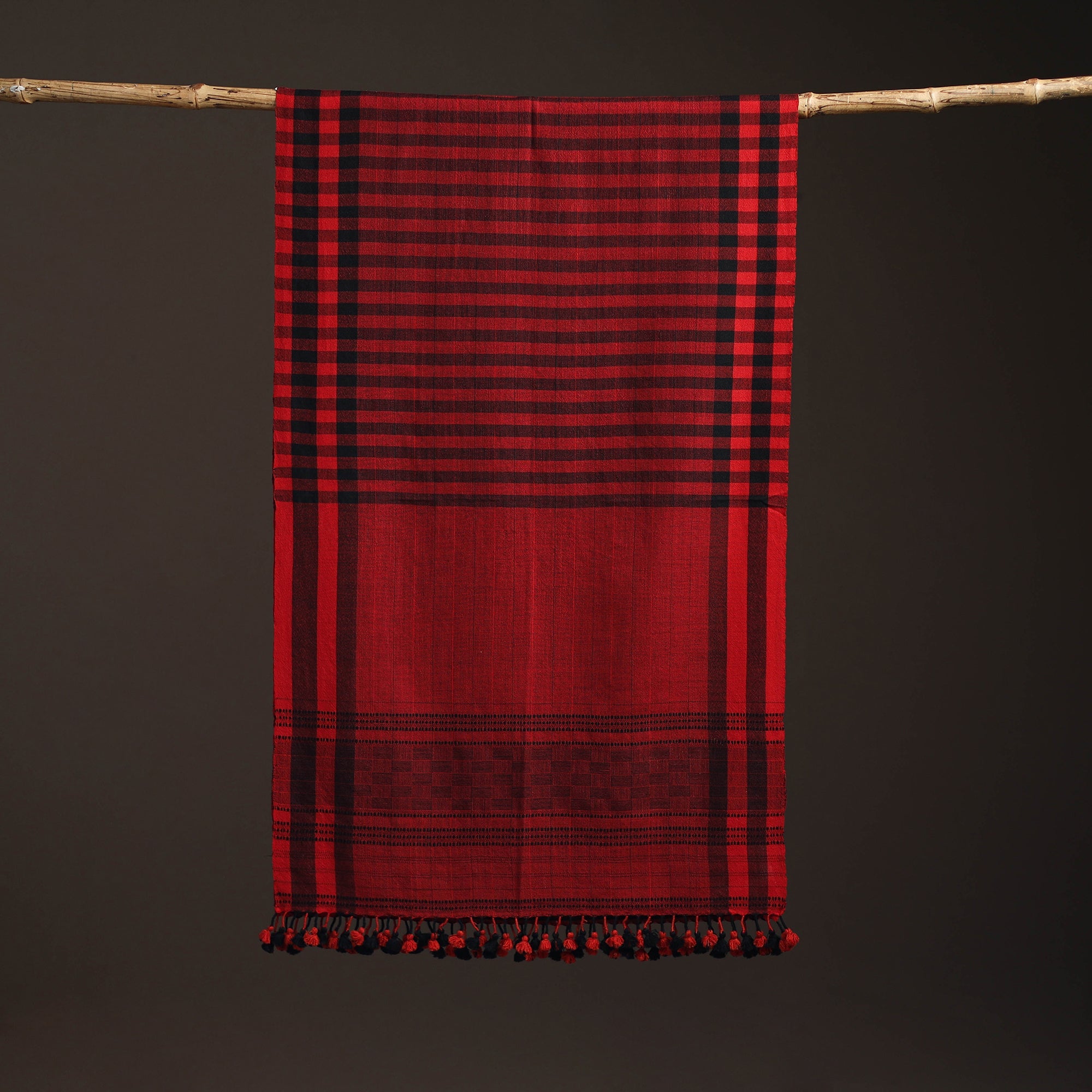 Red bhujodi stole handwoven by Vinay Siju in Bhuj, Gujarat. Designed with traditional Kutchi motifs and tassels. Made from merino wool to provide reliable warmth. A practical choice for everyday winter wear or outings.