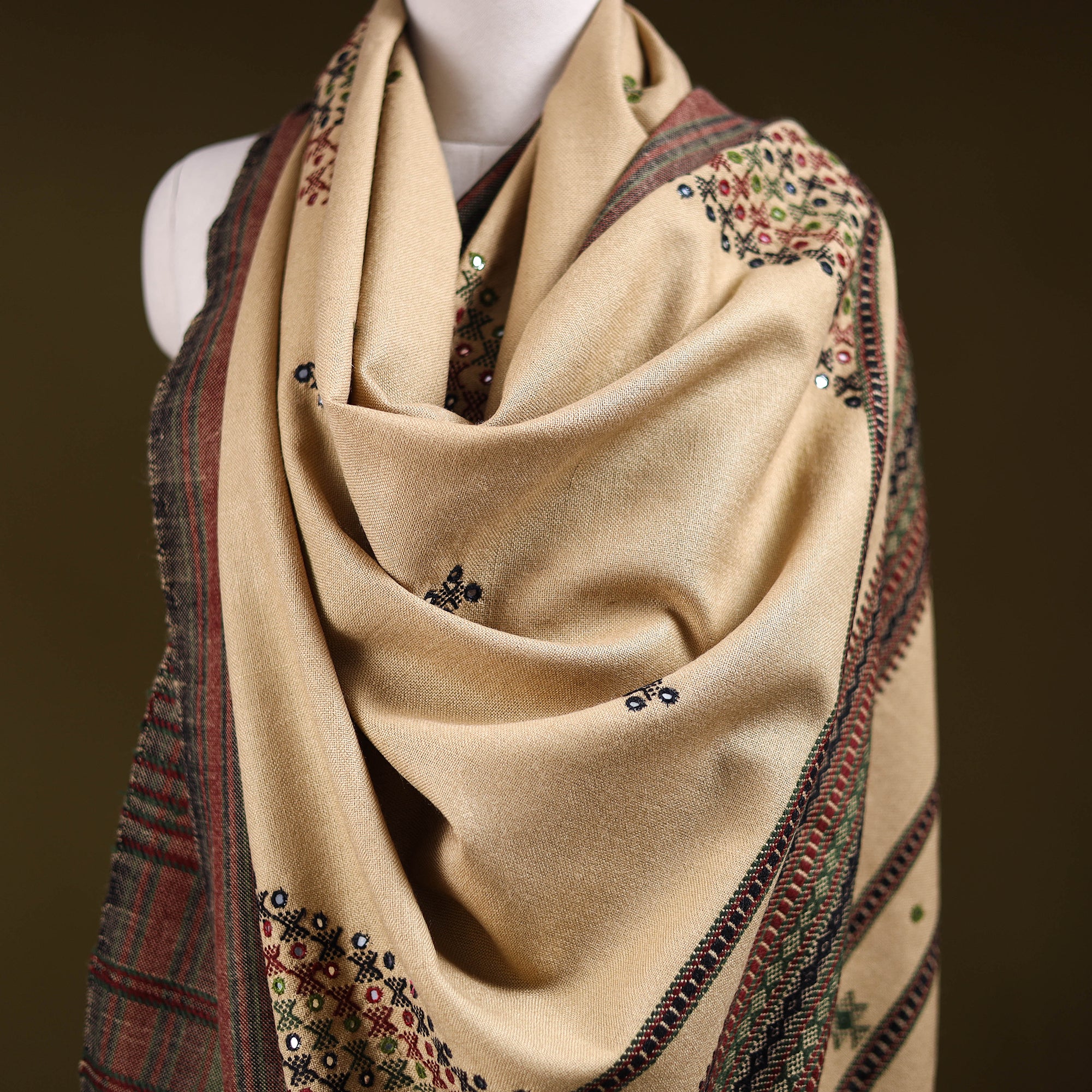 Beige kutch bhujodi handwoven shawl created by skilled artisan Vankar Bhimji Kanji from Bhuj Gujarat. Adorned with traditional mirror work and intricate Kutchi motifs. Made from acrylic wool it offers both warmth and comfort. A perfect blend of tradition and style ideal for everyday elegance or festive wear.