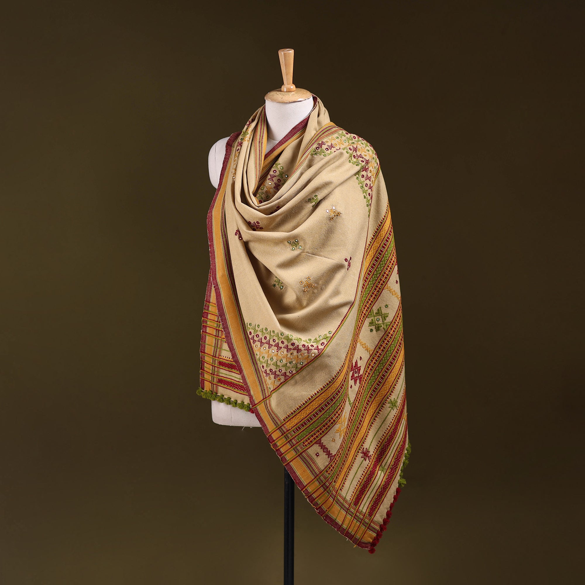 Beige kutch bhujodi handwoven shawl created by skilled artisan Vankar Bhimji Kanji from Bhuj Gujarat. Adorned with traditional mirror work and intricate Kutchi motifs. Made from acrylic wool it offers both warmth and comfort. A perfect blend of tradition and style ideal for everyday elegance or festive wear.