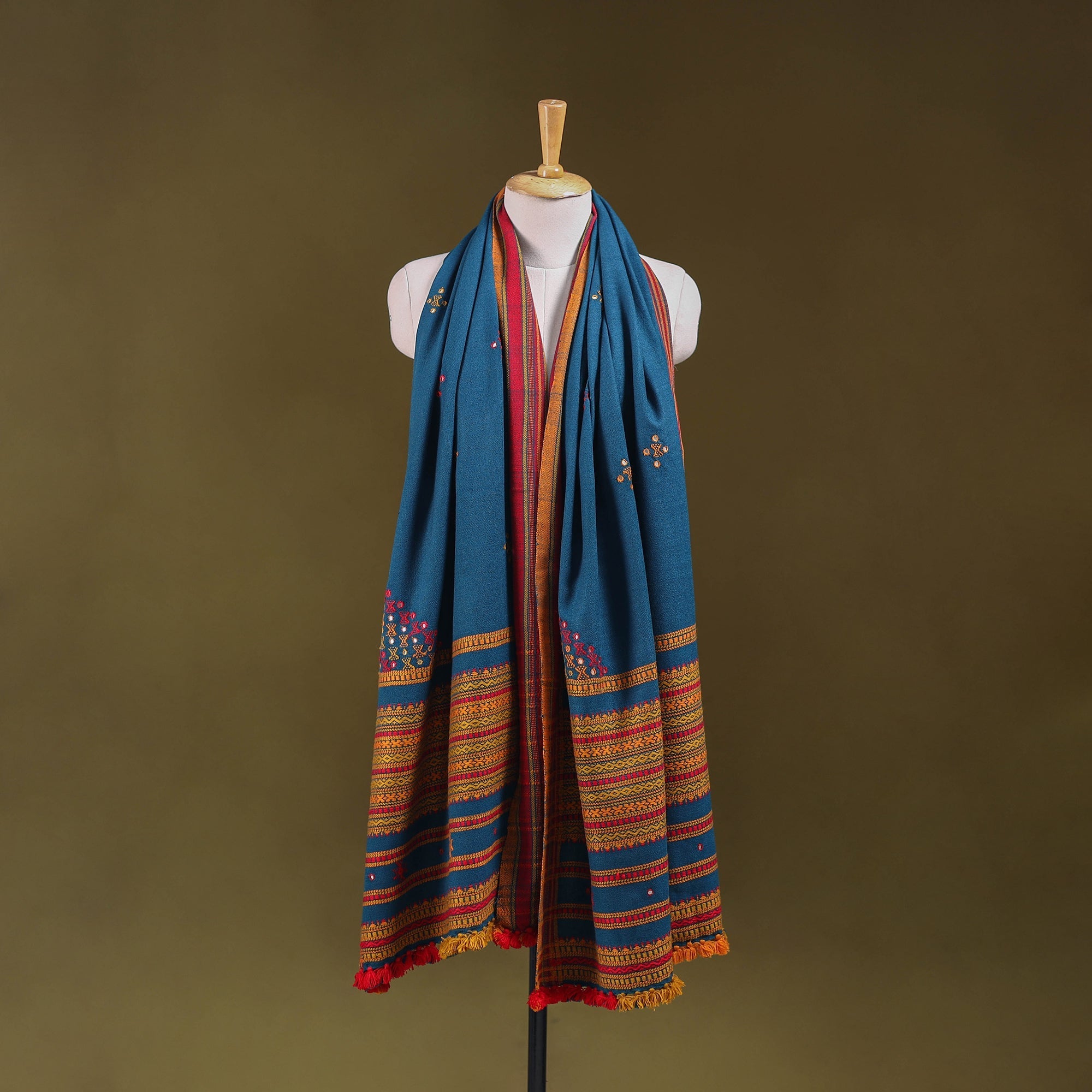 Blue kutch handwoven shawl created by skilled artisan Vankar Bhimji Kanji from Bhuj Gujarat. Adorned with traditional mirror work and intricate Kutchi motifs. Made from acrylic wool it offers both warmth and comfort. A perfect blend of tradition and style ideal for everyday elegance or festive wear.