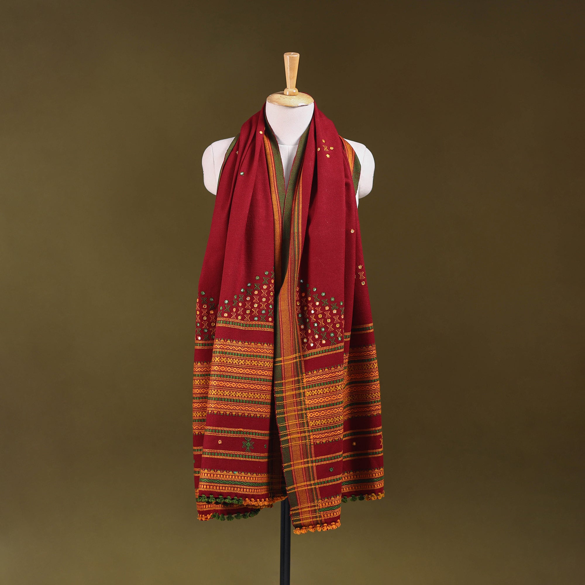 Red kutch bhujodi handwoven shawl created by skilled artisan Vankar Bhimji Kanji from Bhuj Gujarat. Adorned with traditional mirror work and intricate Kutchi motifs. Made from acrylic wool it offers both warmth and comfort. A perfect blend of tradition and style ideal for everyday elegance or festive wear.