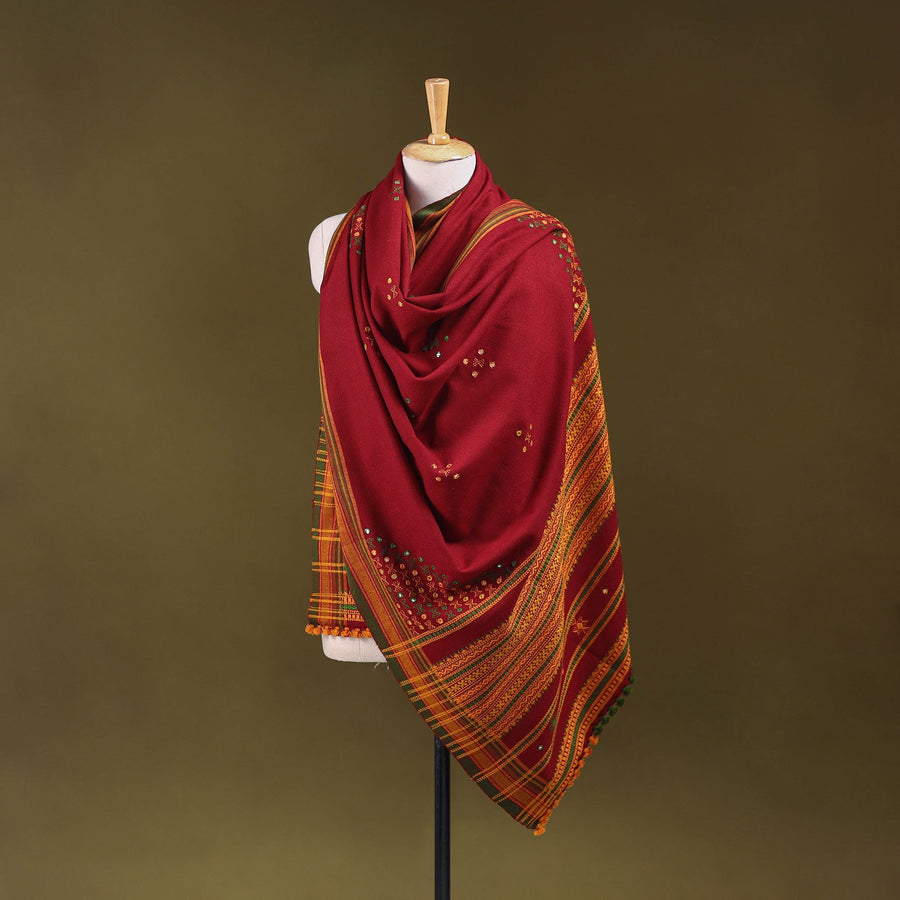 Red kutch handwoven shawl created by skilled artisan Vankar Bhimji Kanji from Bhuj Gujarat. Adorned with traditional mirror work and intricate Kutchi motifs. Made from acrylic wool it offers both warmth and comfort. A perfect blend of tradition and style ideal for everyday elegance or festive wear.