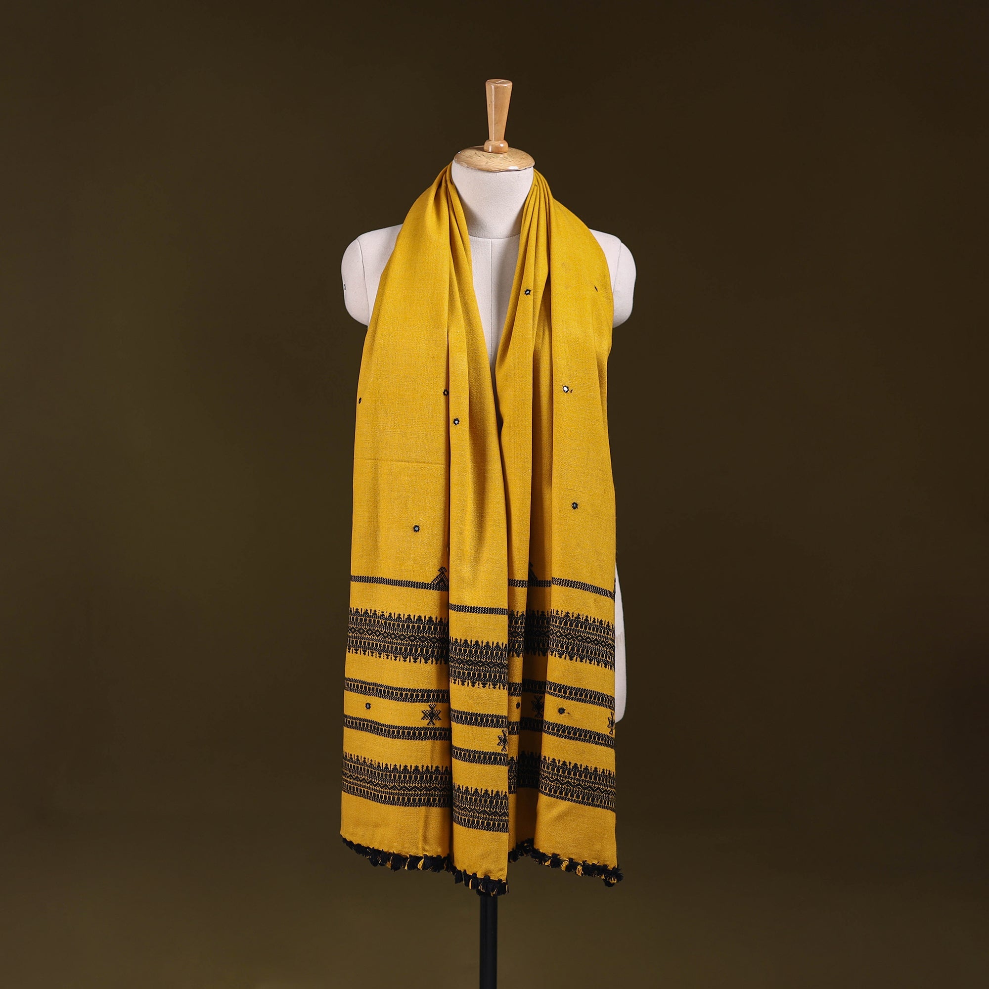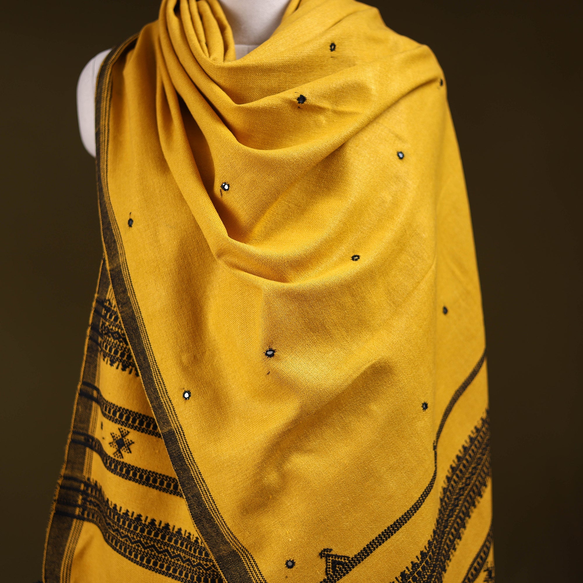 Yellow kutch bhujodi handwoven shawl created by skilled artisan Vankar Bhimji Kanji from Bhuj Gujarat. Adorned with traditional mirror work and intricate Kutchi motifs. Made from acrylic wool it offers both warmth and comfort. A perfect blend of tradition and style ideal for everyday elegance or festive wear.