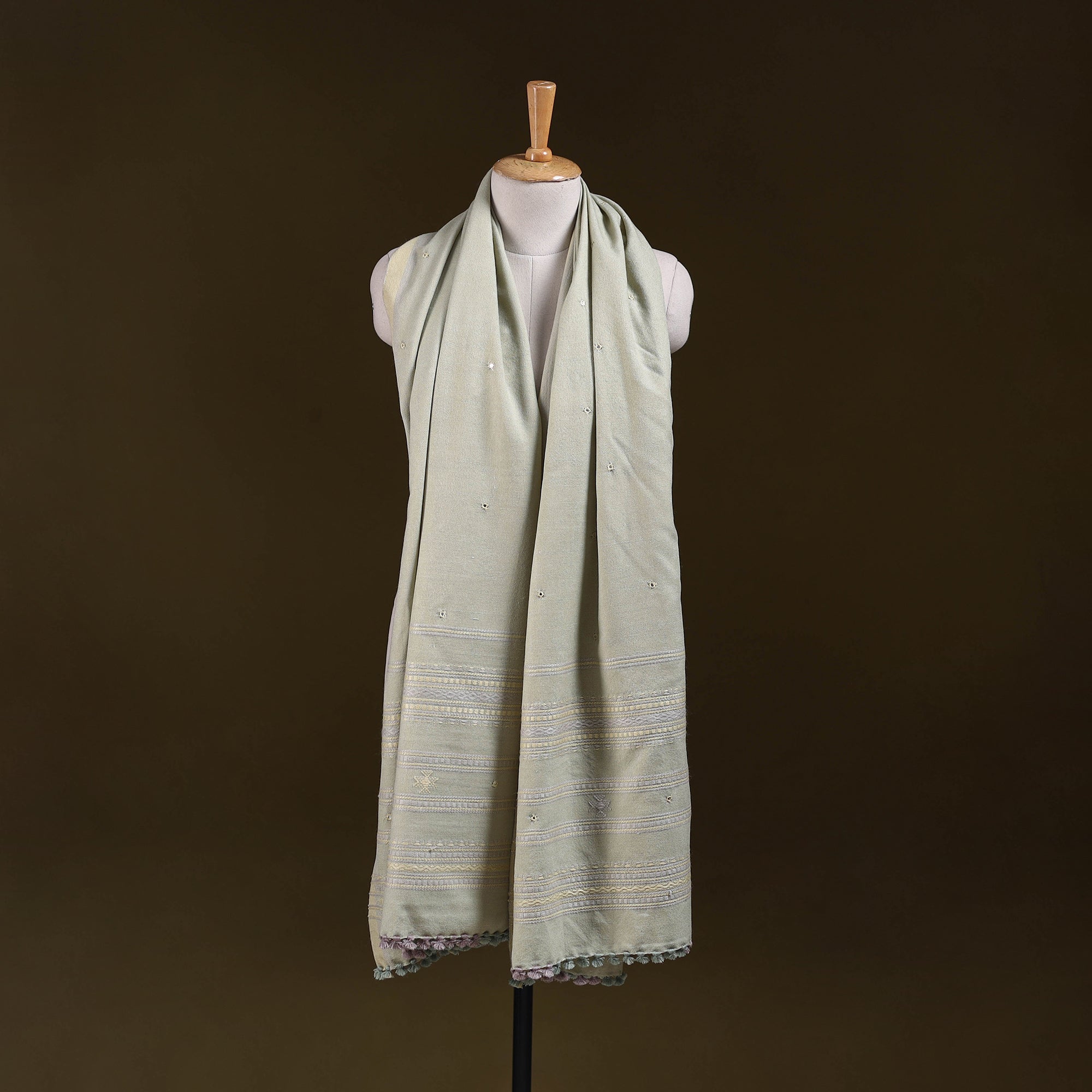 Beige kutch handwoven shawl created by skilled artisan Vankar Bhimji Kanji from Bhuj Gujarat. Adorned with traditional mirror work and intricate Kutchi motifs. Made from acrylic wool it offers both warmth and comfort. A perfect blend of tradition and style ideal for everyday elegance or festive wear.