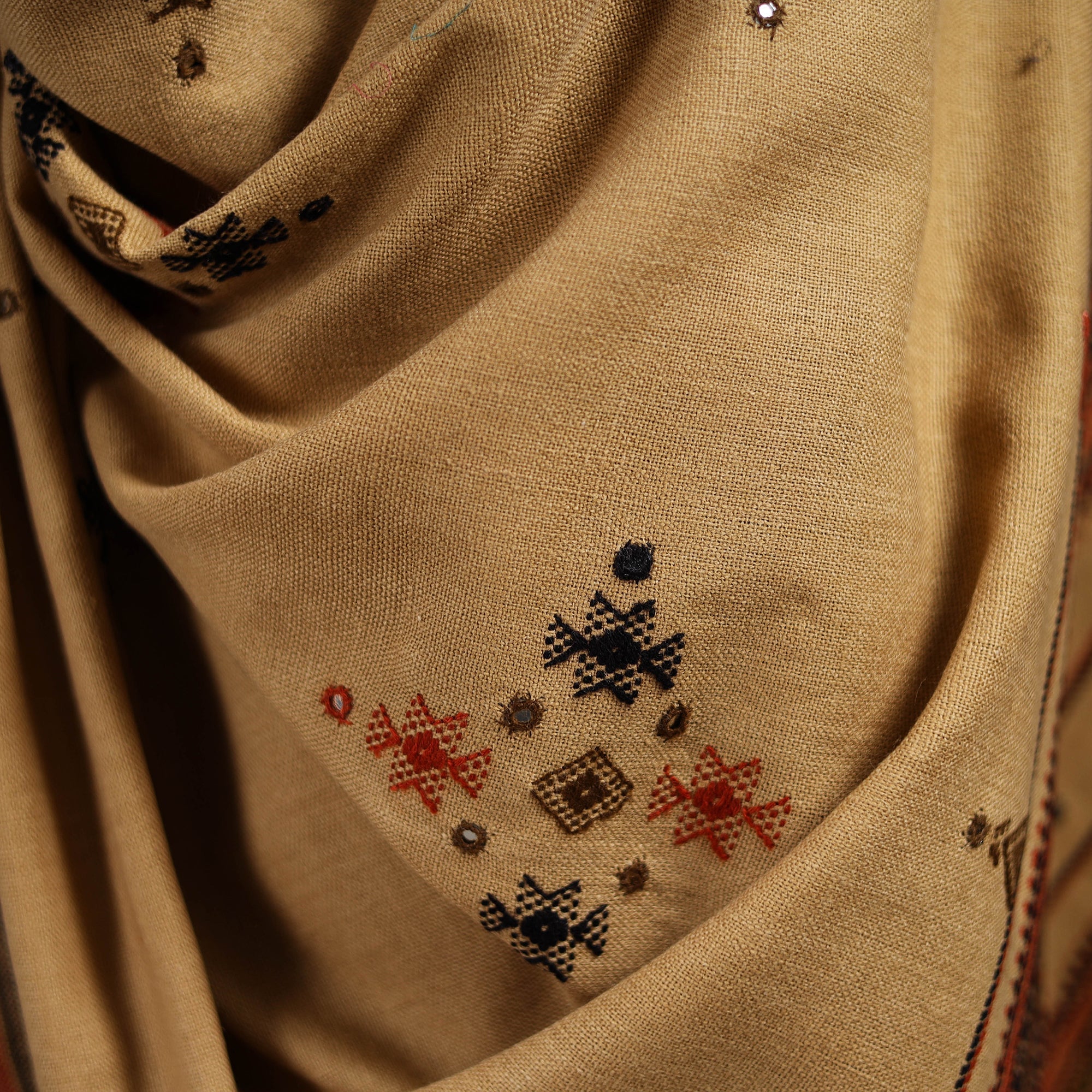 Beige kutch bhujodi handwoven shawl is thoughtfully created by skilled artisans from Kutch, Gujarat. Adorned with traditional mirror work and intricate Kutchi motifs, it is made from acrylic wool that offers both warmth and comfort. A perfect blend of tradition and style, it is ideal for everyday elegance or occasion wear.