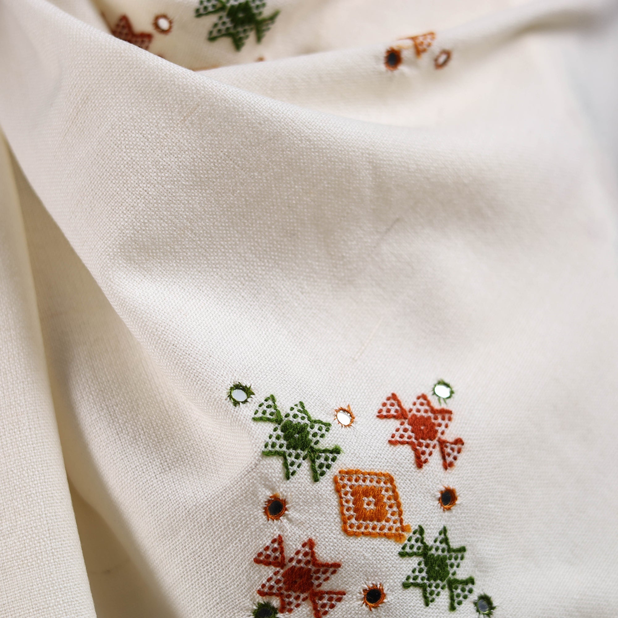 White kutch bhujodi handwoven shawl created by skilled artisan Vankar Bhimji Kanji from Bhuj Gujarat. Adorned with traditional mirror work and intricate Kutchi motifs. Made from acrylic wool it offers both warmth and comfort. A perfect blend of tradition and style ideal for everyday elegance or festive wear.