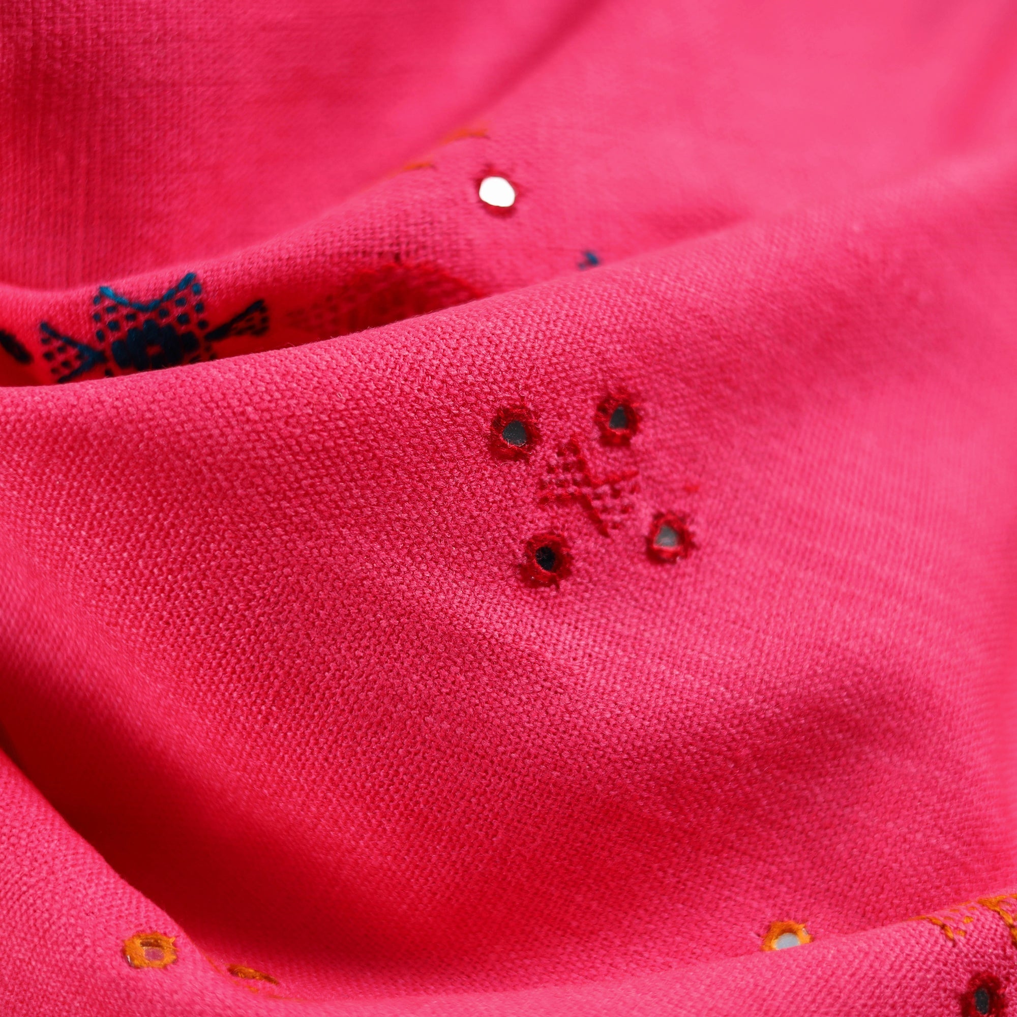 Pink kutch bhujodi handwoven shawl created by skilled artisan Vankar Bhimji Kanji from Bhuj Gujarat. Adorned with traditional mirror work and intricate Kutchi motifs. Made from acrylic wool it offers both warmth and comfort. A perfect blend of tradition and style ideal for everyday elegance or festive wear.