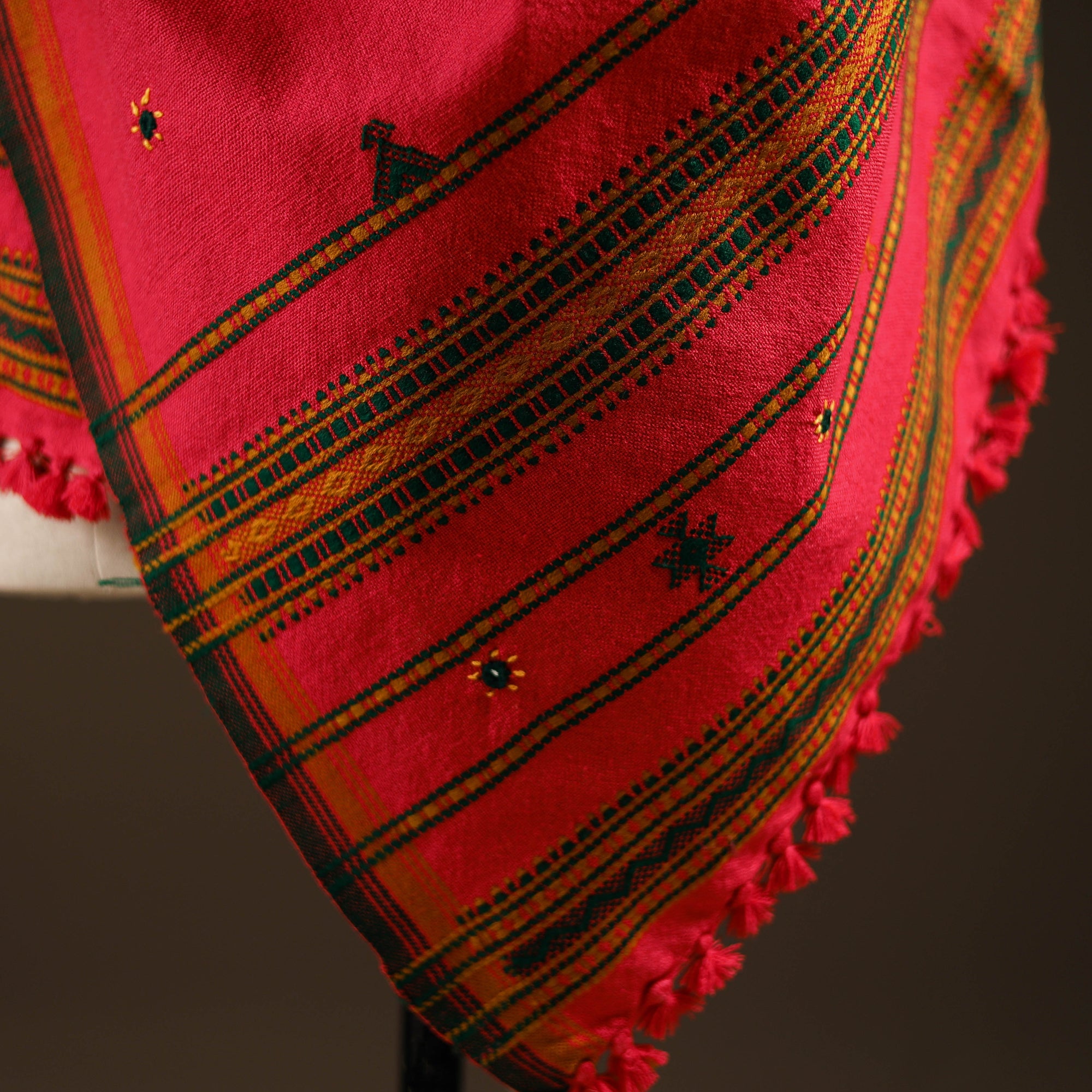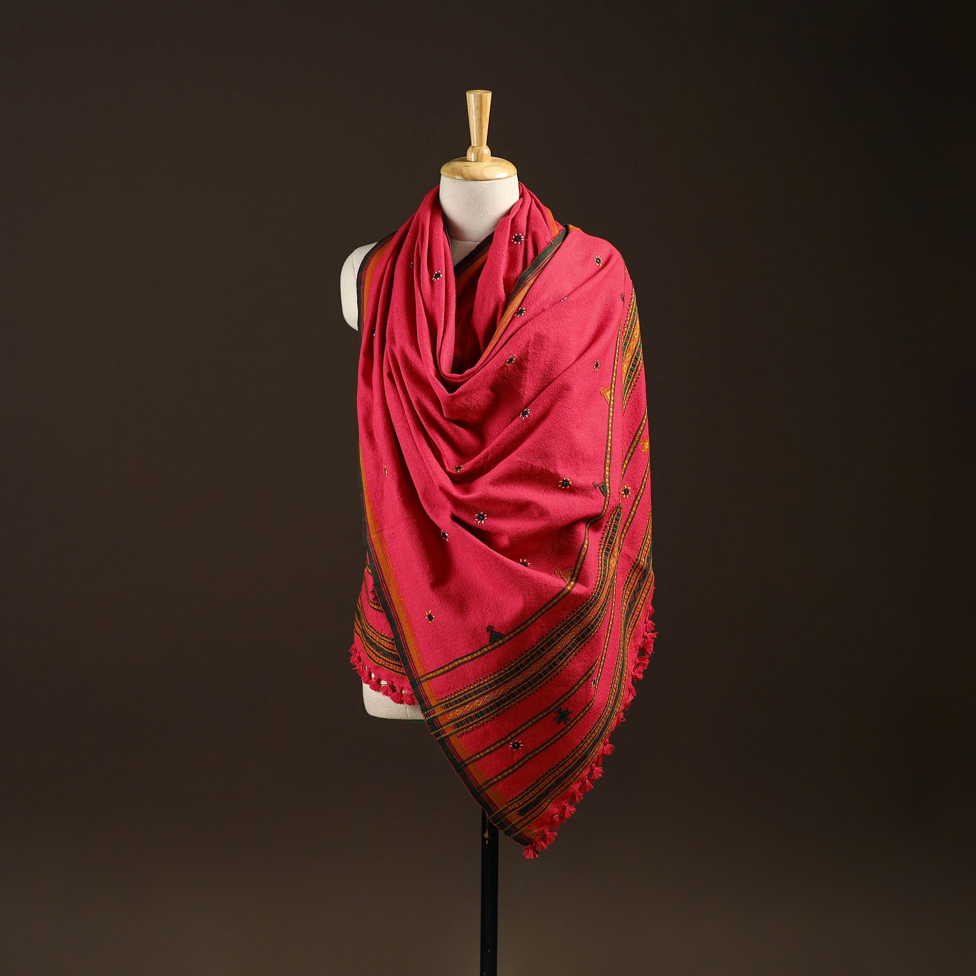 Pink bhujodi shawl handwoven by Vinay Siju in Bhuj, Gujarat. Designed with traditional Kutchi motifs, subtle mirror details and tassels. Made from acrylic wool to provide reliable warmth. A practical choice for everyday winter wear or outings.