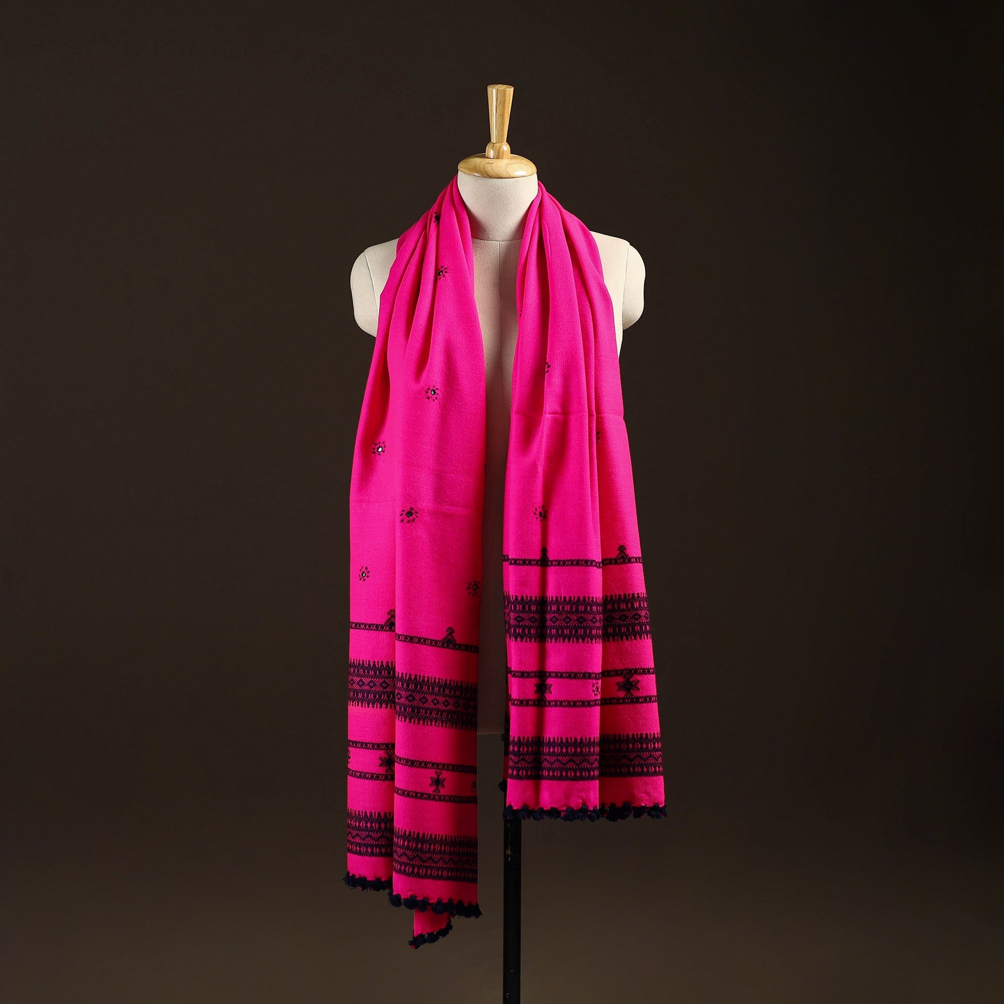 Pink bhujodi shawl handwoven by Vinay Siju in Bhuj, Gujarat. Designed with traditional Kutchi motifs, subtle mirror details and tassels. Made from acrylic wool to provide reliable warmth. A practical choice for everyday winter wear or outings.