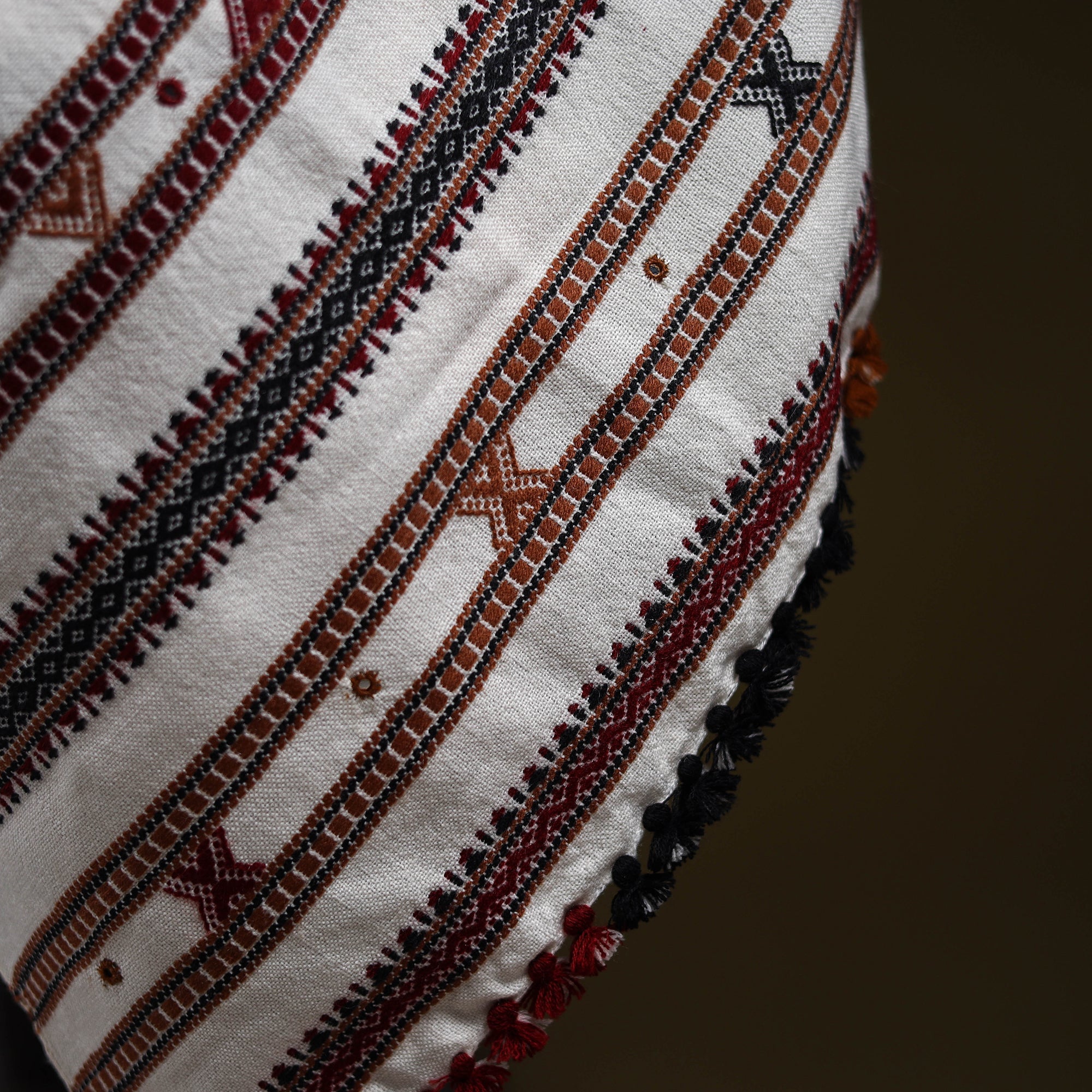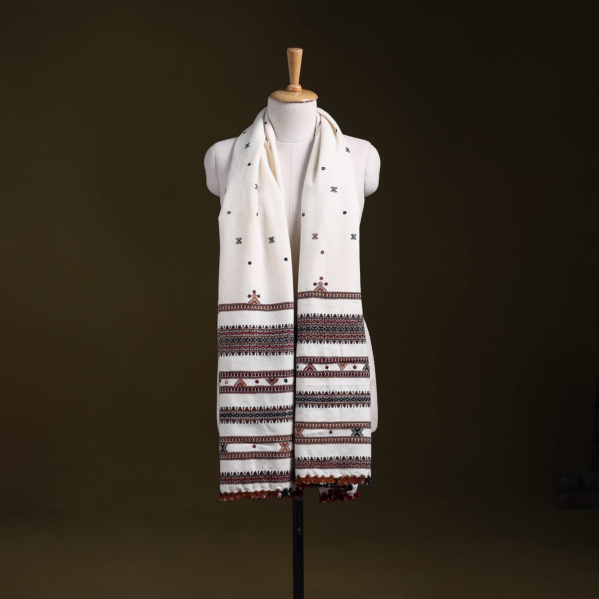 Wrap yourself in the heritage of Kutch with this white bhujodi handwoven woollen shawl, created by skilled artisans of Bhuj, Gujarat. Embellished with traditional mirror work and intricate Kutchi motifs, it showcases timeless regional beauty. Made from soft acrylic wool, it offers both warmth and comfort. A perfect blend of tradition and style, ideal for everyday elegance or festive wear.