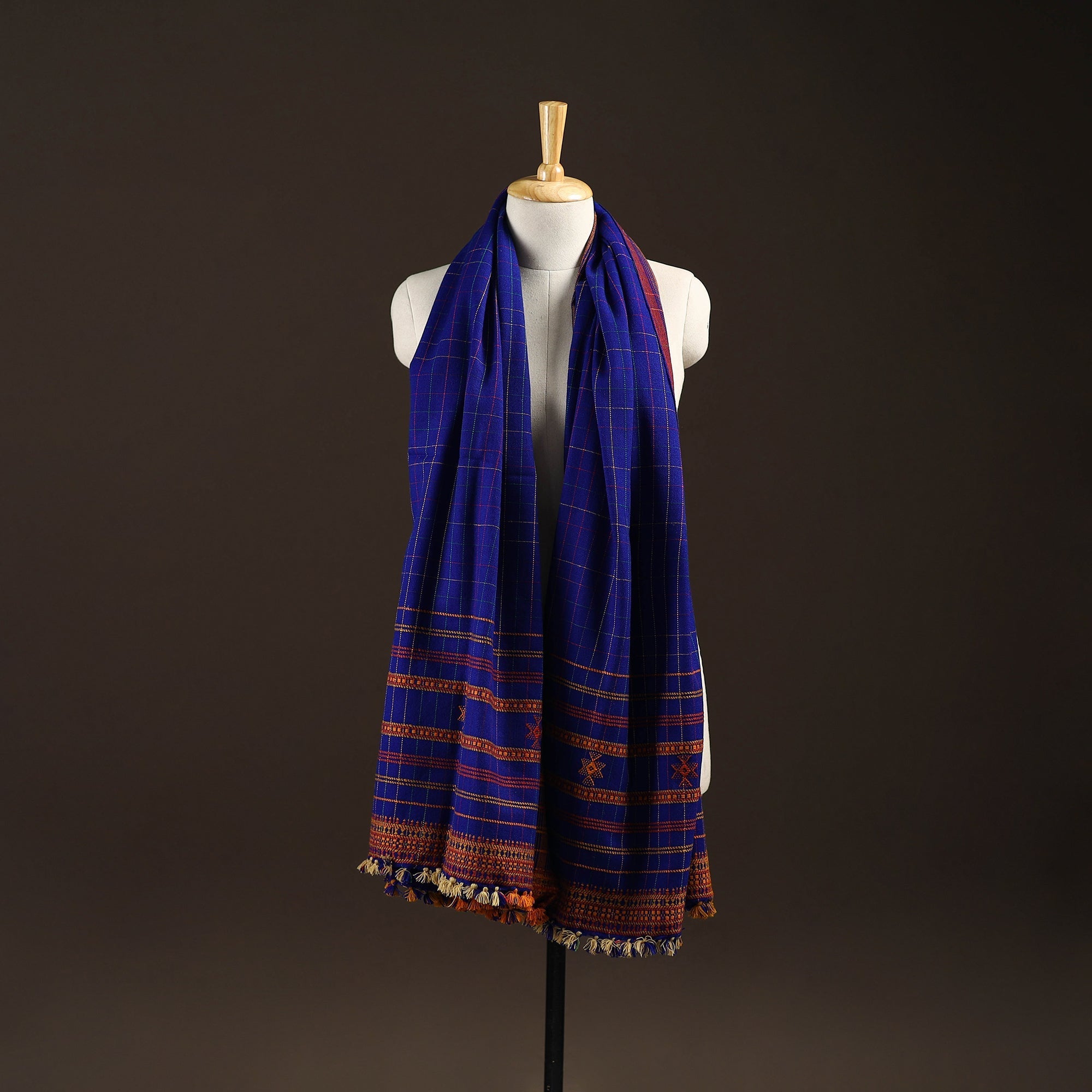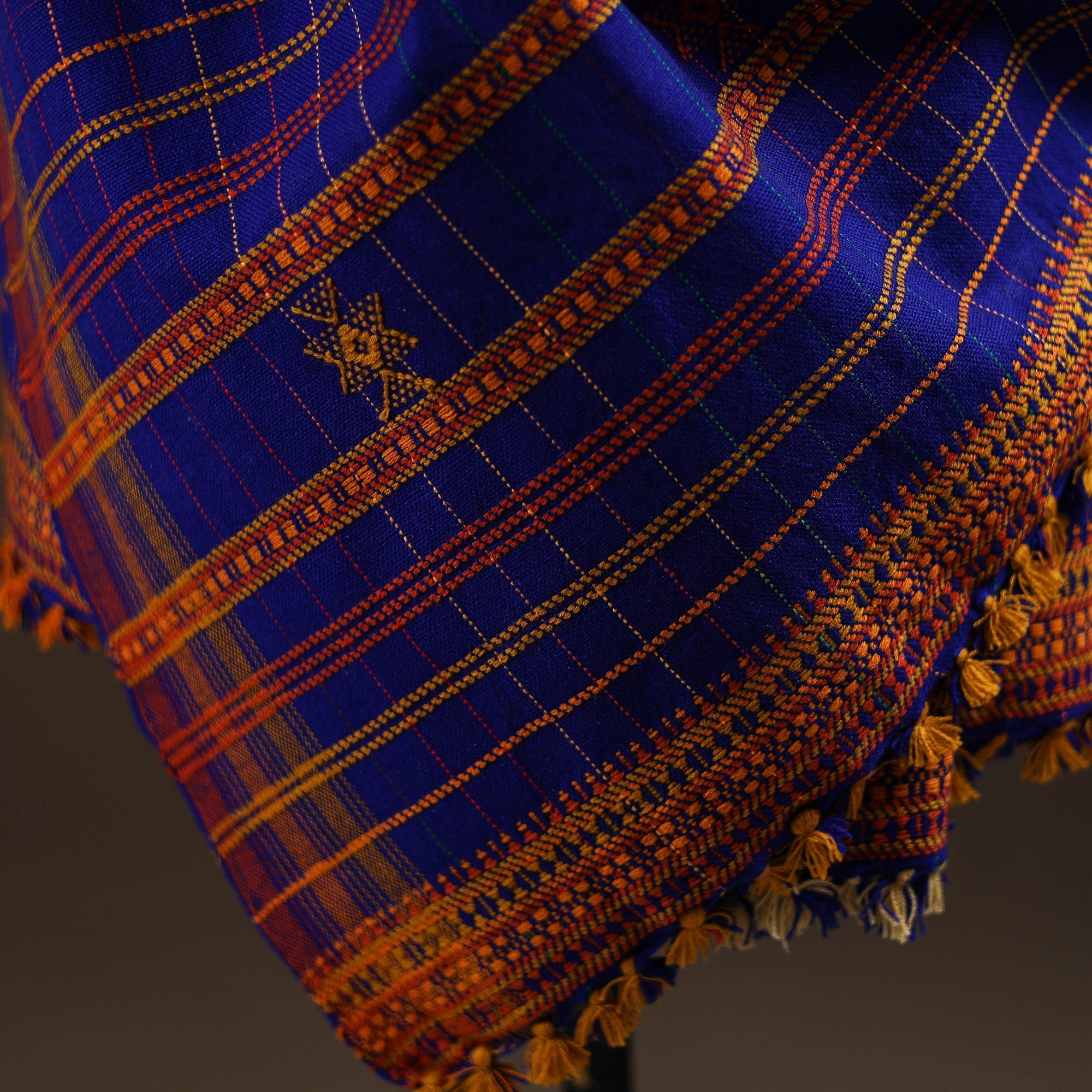 Blue bhujodi shawl handwoven by Vinay Siju in Bhuj, Gujarat. Designed with traditional Kutchi motifs and tassels. Made from acrylic wool to provide reliable warmth. A practical choice for everyday winter wear or outings.