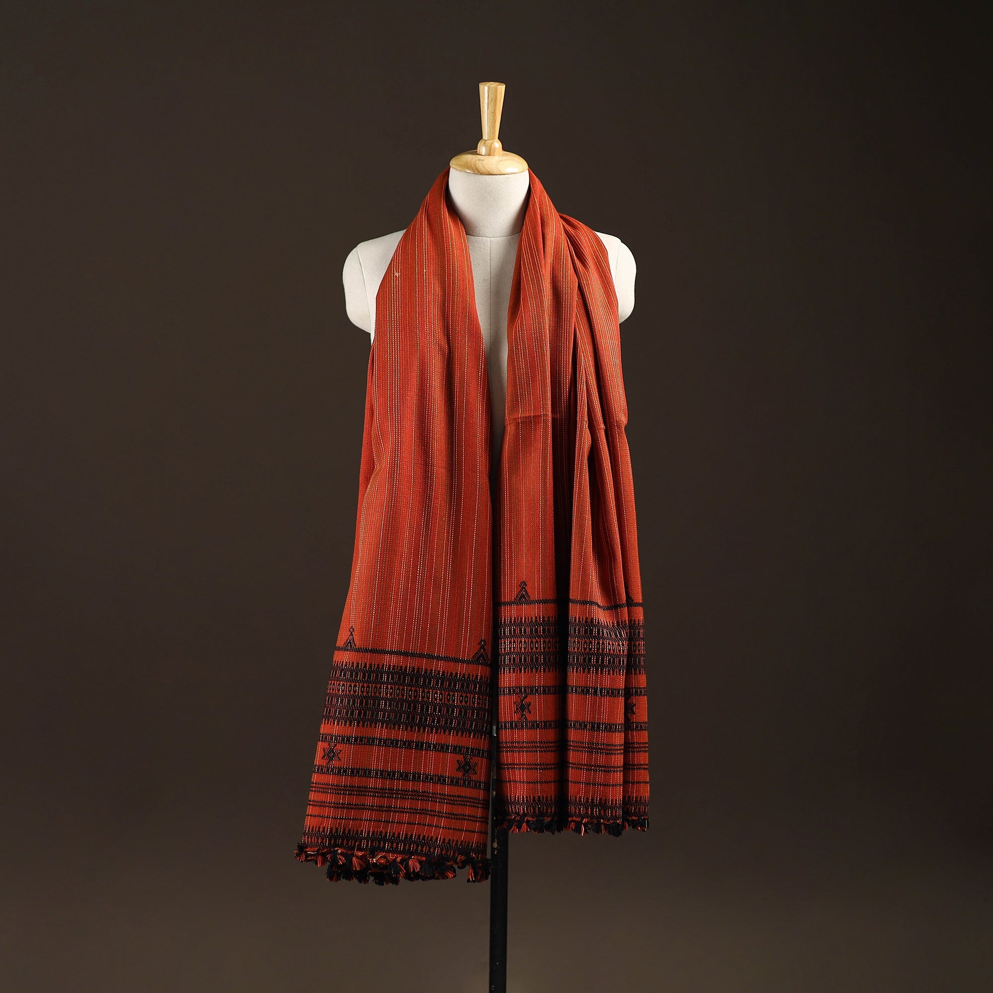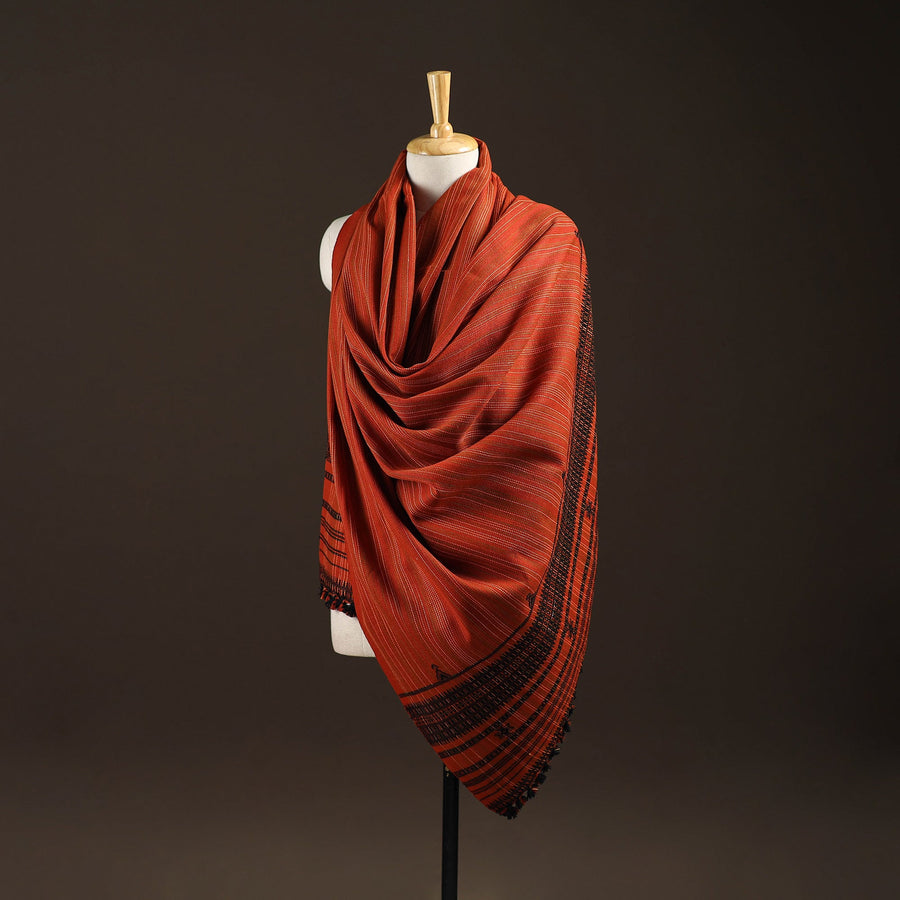 Bhujodi shawl handwoven by Vinay Siju in Bhuj, Gujarat. Designed with traditional Kutchi motifs and tassels. Made from acrylic wool to provide reliable warmth. A practical choice for everyday winter wear or outings.