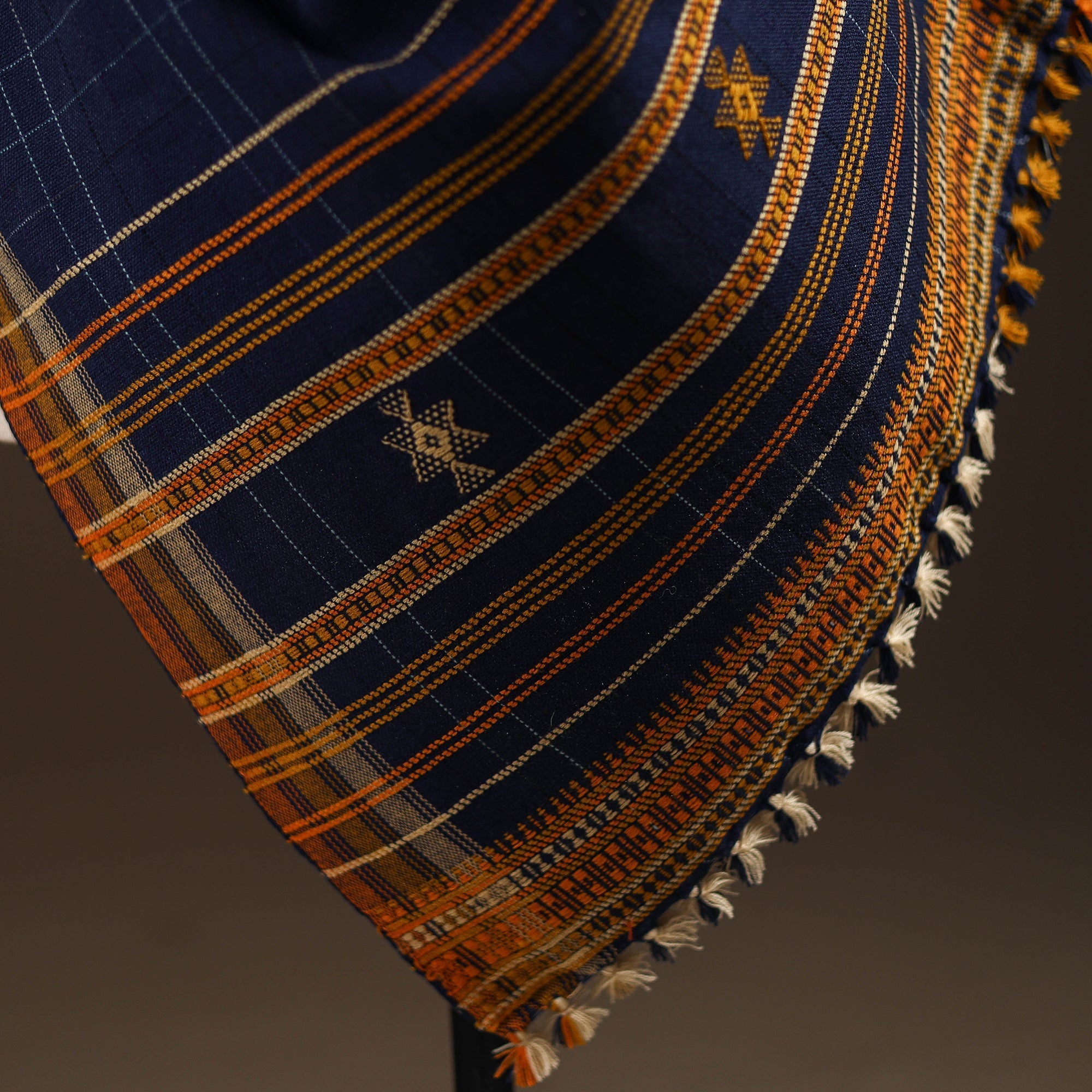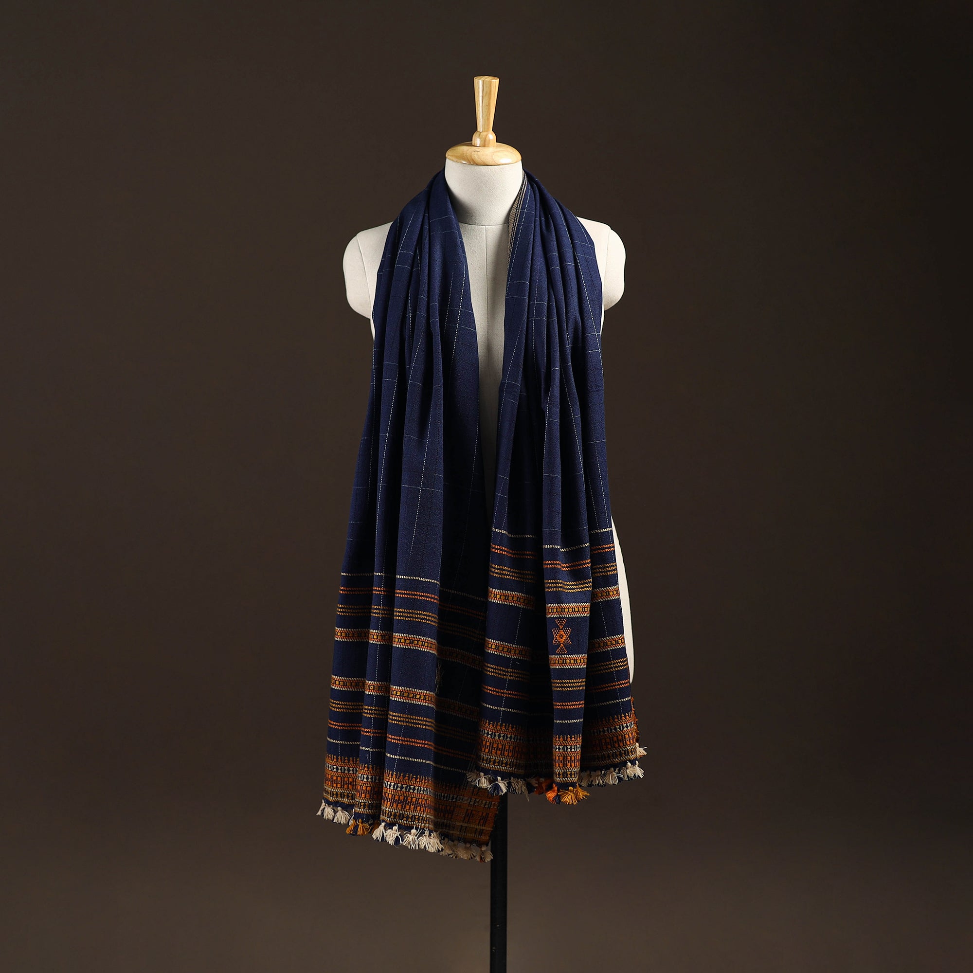 Blue bhujodi shawl handwoven by Vinay Siju in Bhuj, Gujarat. Designed with traditional Kutchi motifs and tassels. Made from acrylic wool to provide reliable warmth. A practical choice for everyday winter wear or outings.