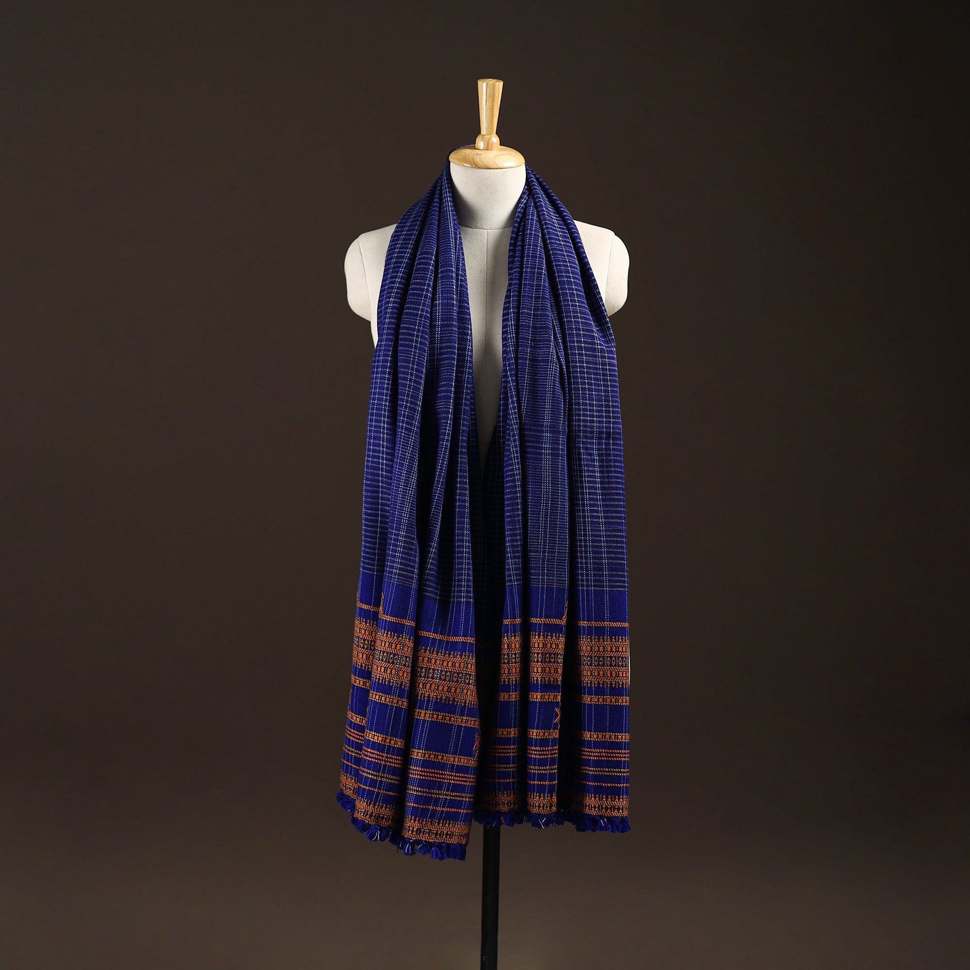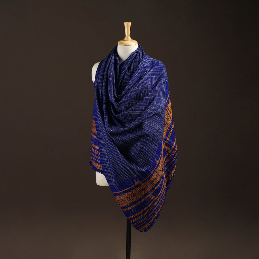 Blue bhujodi shawl handwoven by Vinay Siju in Bhuj, Gujarat. Designed with traditional Kutchi motifs and tassels. Made from acrylic wool to provide reliable warmth. A practical choice for everyday winter wear or outings.