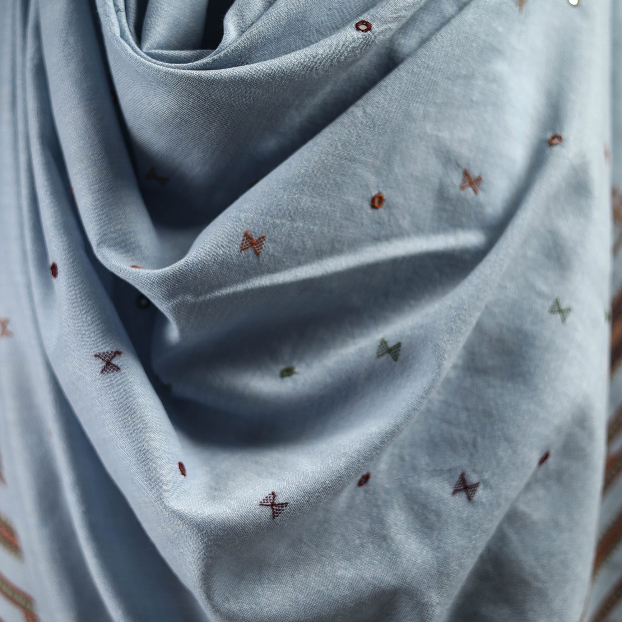 This blue kutch bhujodi mirror work handwoven shawl is crafted by skilled artisans in Gujarat’s Kutch region. Made from soft, warm merino wool, it offers comfort, durability, and elegant traditional patterns. Its lightweight yet cozy feel makes it perfect for winter styling. Ethically sourced and beautifully designed, this shawl adds cultural heritage and timeless style to your everyday wardrobe.