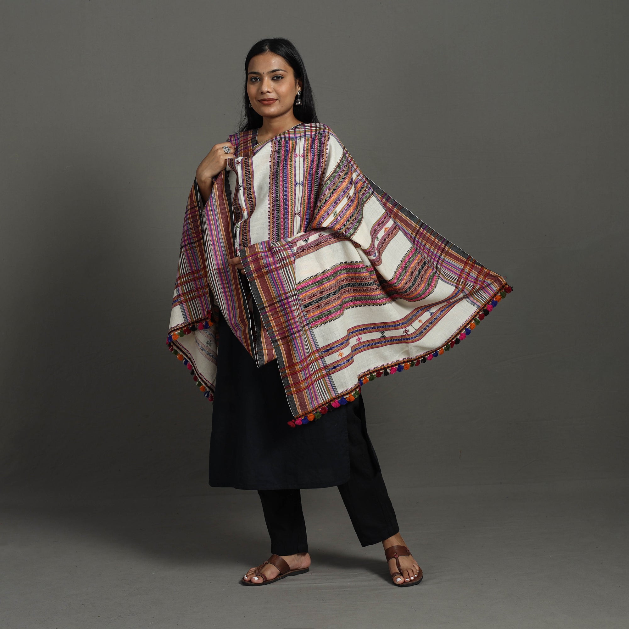 Embrace the beauty of multicolor kutch bhujodi weaving handloom woolen shawl. Each piece is handloomed by skilled artisans, featuring delicate tassels. The Bhujodi craft, rooted in the rich cultural heritage of Kutch, brings timeless elegance to this soft and warm shawl.