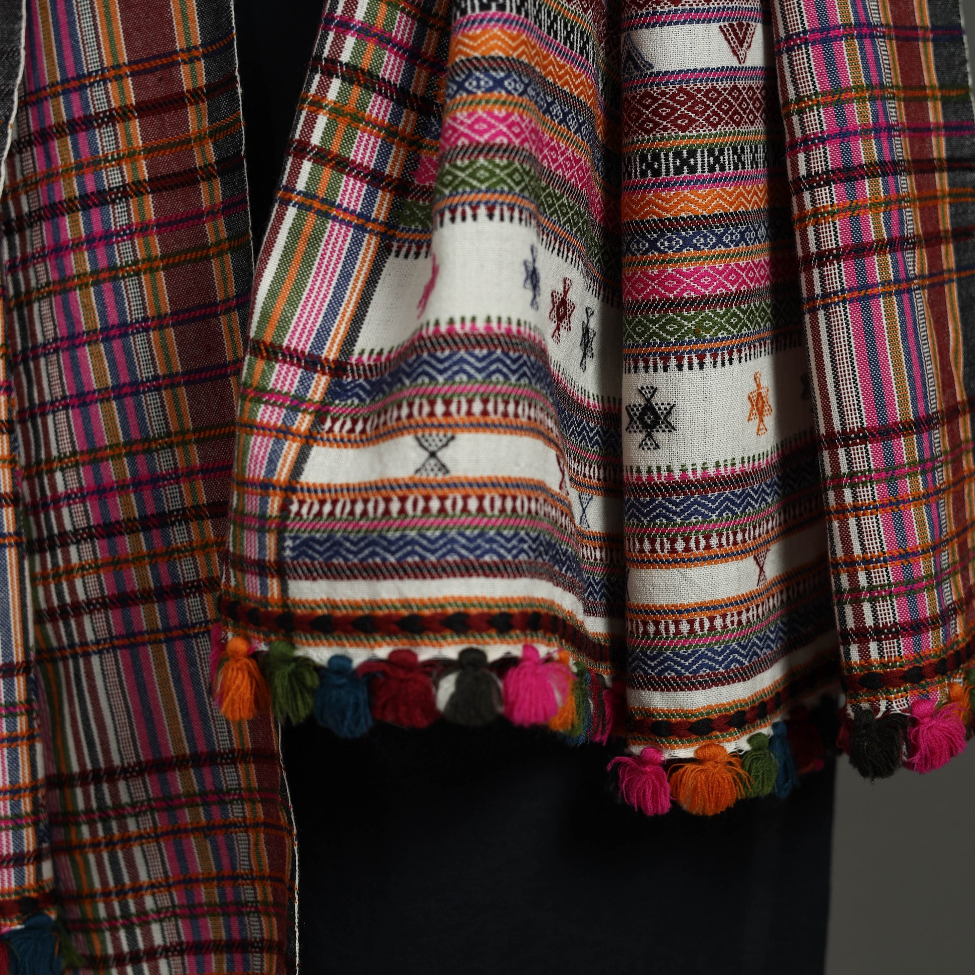 Embrace the beauty of white kutch bhujodi weaving handloom woolen shawl. Each piece is handloomed by skilled artisans, featuring delicate tassels. The Bhujodi craft, rooted in the rich cultural heritage of Kutch, brings timeless elegance to this soft and warm shawl.