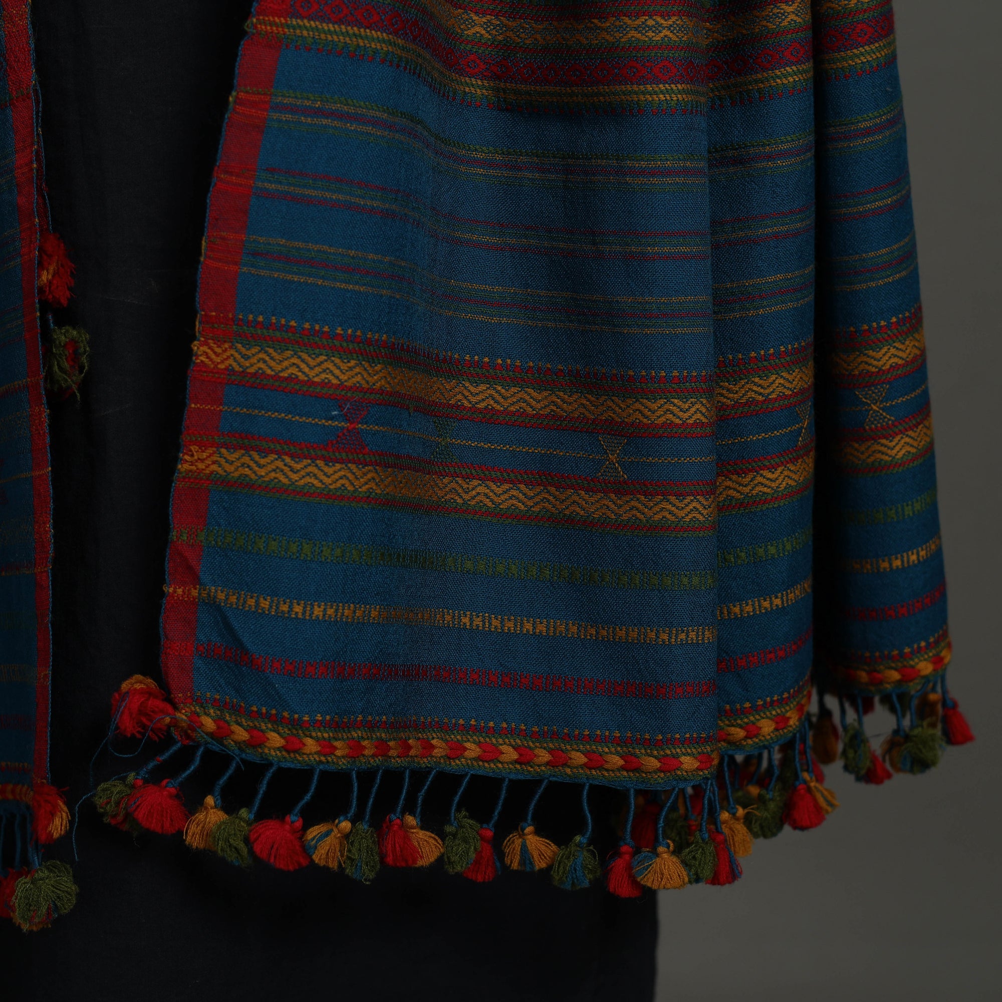 Embrace the beauty of blue kutch bhujodi weaving mirror work handloom woolen shawl. Each piece is handloomed by skilled artisans, featuring delicate mirror work and finished with tassels. The bhujodi craft, rooted in the rich cultural heritage of Kutch, brings timeless elegance to this soft and warm shawl.