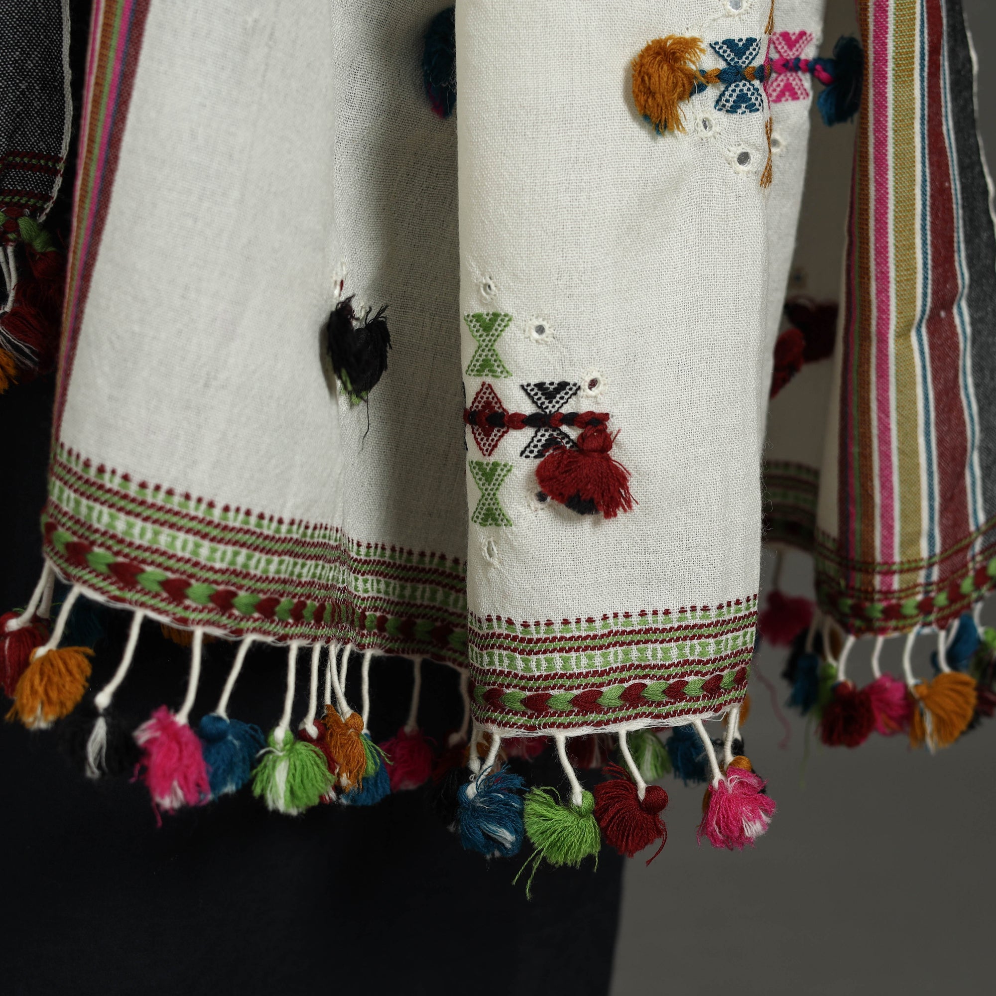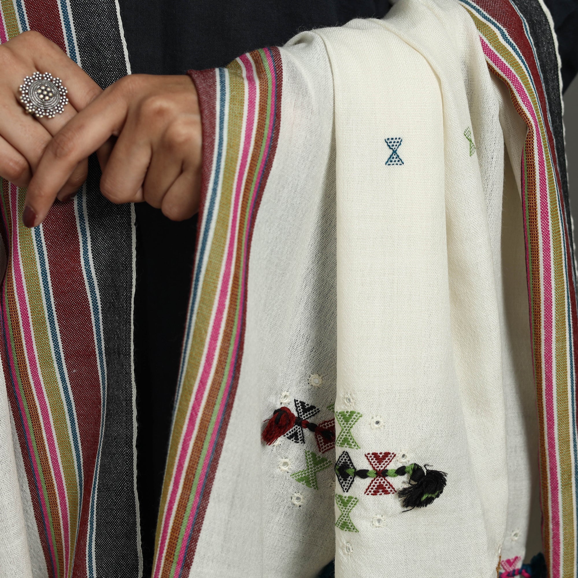 Embrace the beauty of white kutch bhujodi weaving mirror work handloom woolen shawl. Each piece is handloomed by skilled artisans, featuring delicate mirror work and finished with tassels. The bhujodi craft, rooted in the rich cultural heritage of Kutch, brings timeless elegance to this soft and warm shawl.