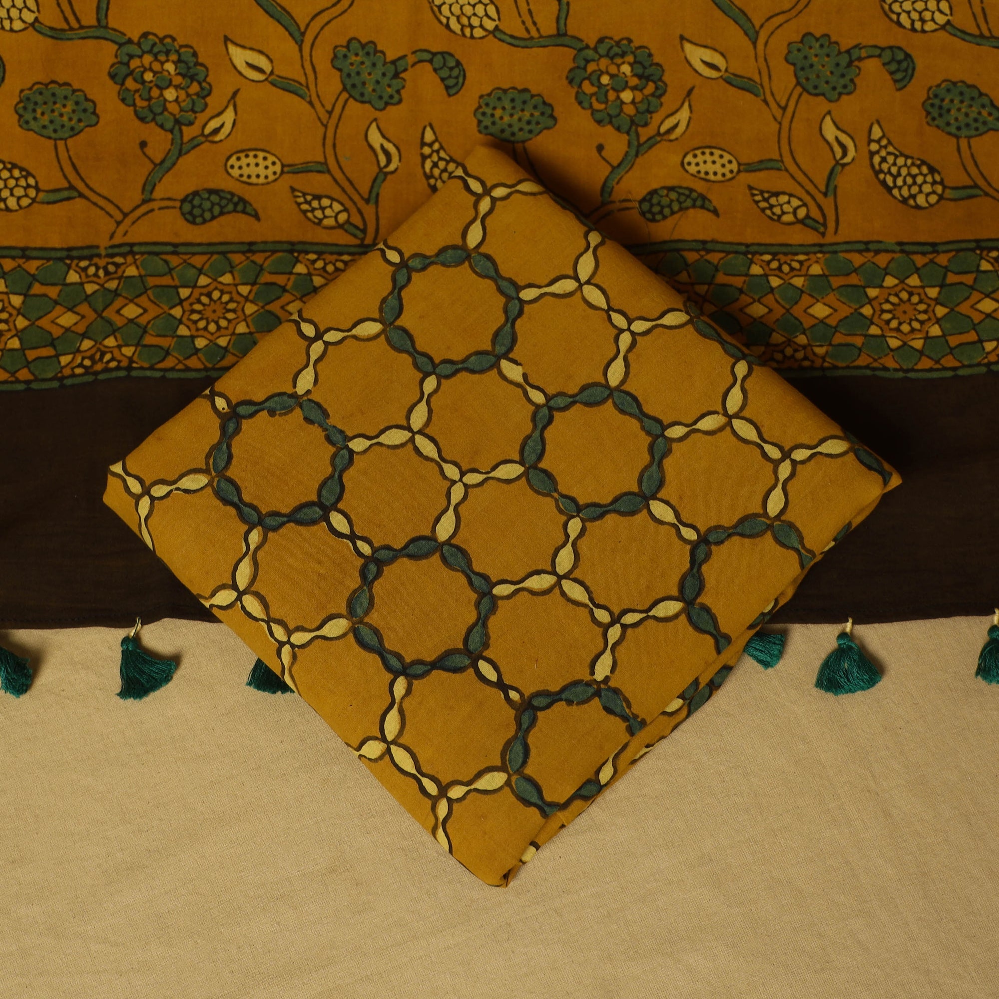 Elevate your wardrobe with this green kutch block print cotton 3pc ajrakh dress material, made with by artisans from Kutch, Gujarat. The ajrakh technique uses natural dyes, creating intricate patterns that reflect India’s rich textile heritage. this suit material is perfect for festive occasions or daily wear.