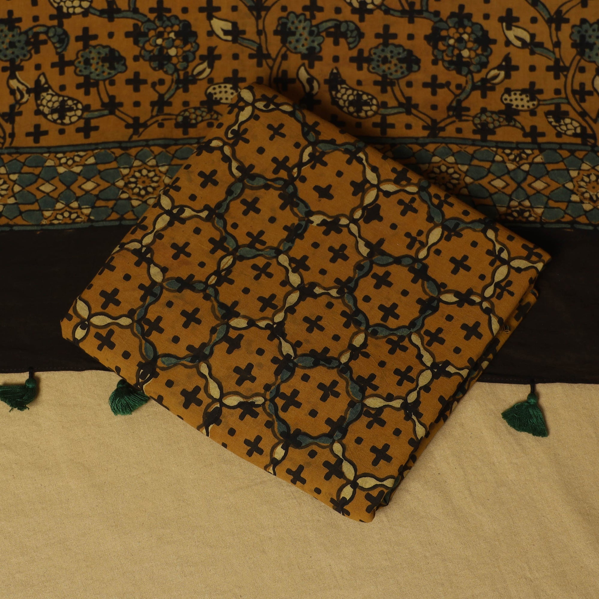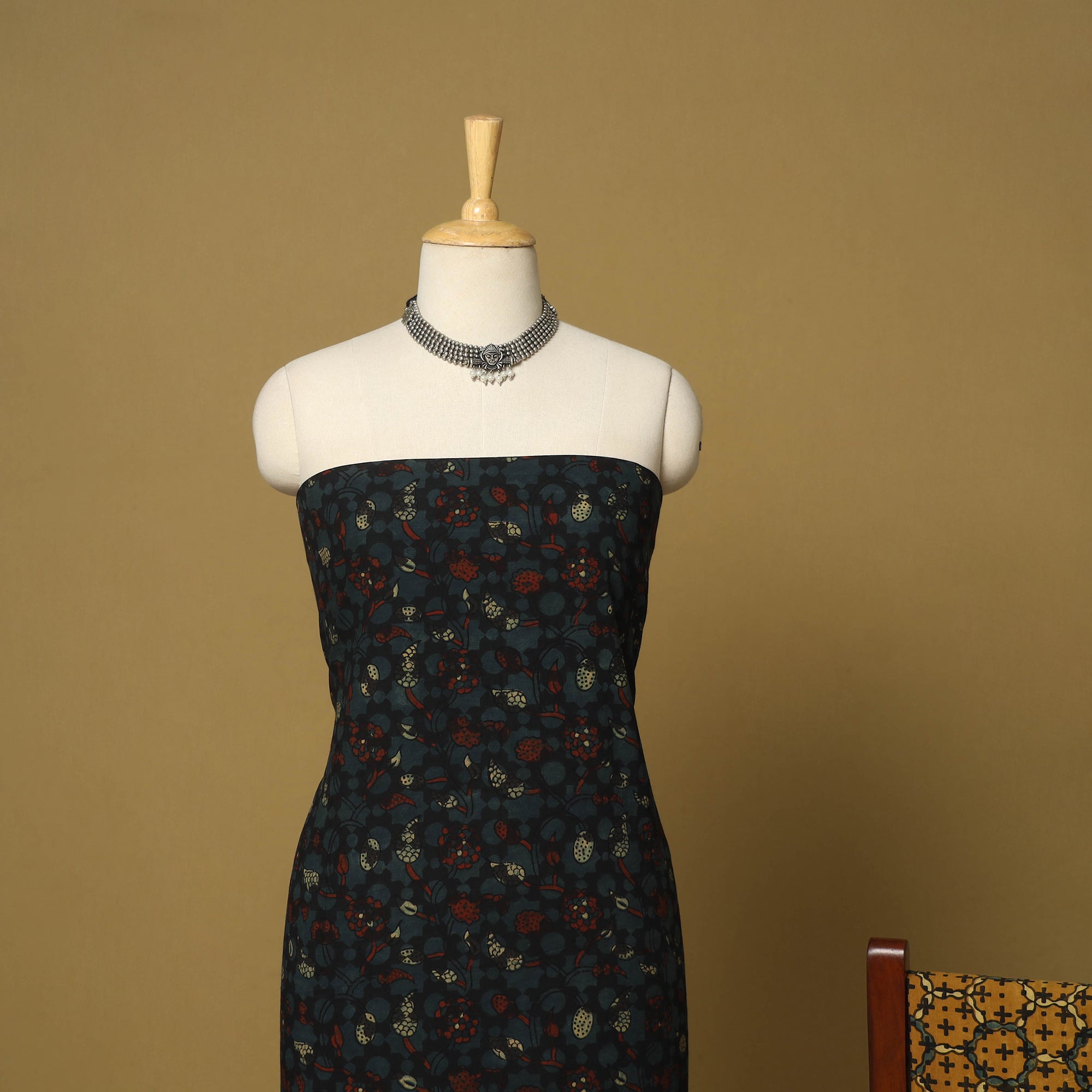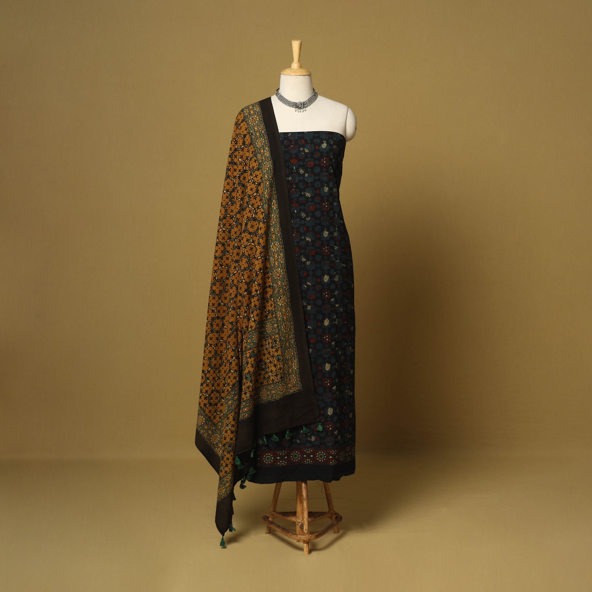 Celebrate timeless craftsmanship with this kutch block print cotton 3pc black ajrakh dress material, hand block printed in Kutch, Gujarat using natural dyes and the ancient Ajrakh technique. This 3pc suit set includes cotton kurta fabric, bottom, and dupatta adorned with rich motifs that reflect India’s cultural legacy. Perfect for festive occasions or for creating an elegant ethnic look for office wear.