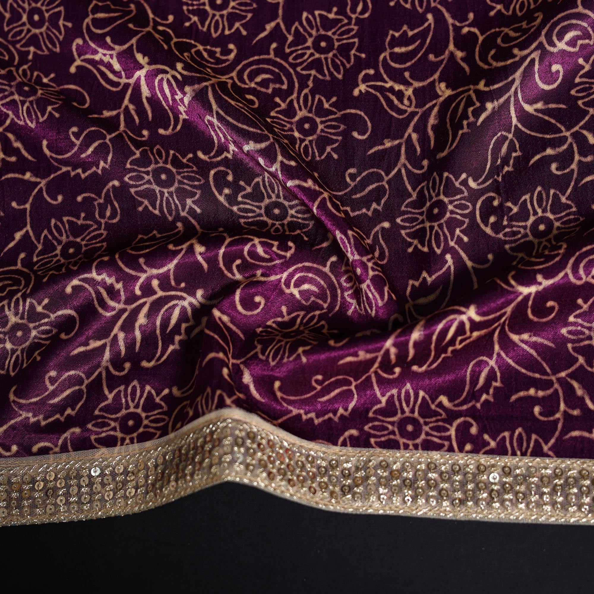Purple lace work blouse piece created using hand block printing techniques, It features motifs inspired by the textile traditions of Gujarat’s Kutch region. Made from modal silk, known for its smooth texture and comfortable drape, it pairs well with a wide range of sarees. Easy to tailor in your preferred style, it’s a dependable choice for creating elegant and versatile blouse designs.