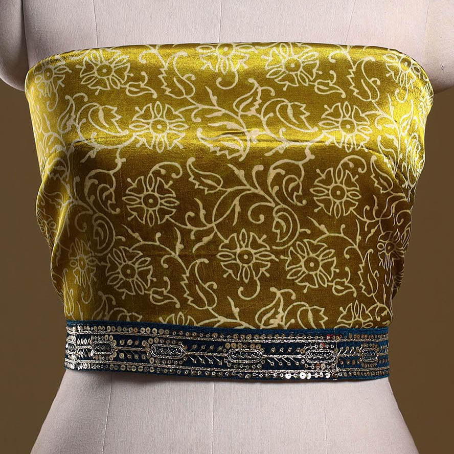 Yellow lace work blouse piece created using hand block printing techniques, It features motifs inspired by the textile traditions of Gujarat’s Kutch region. Made from modal silk, known for its smooth texture and comfortable drape, it pairs well with a wide range of sarees. Easy to tailor in your preferred style, it’s a dependable choice for creating elegant and versatile blouse designs.