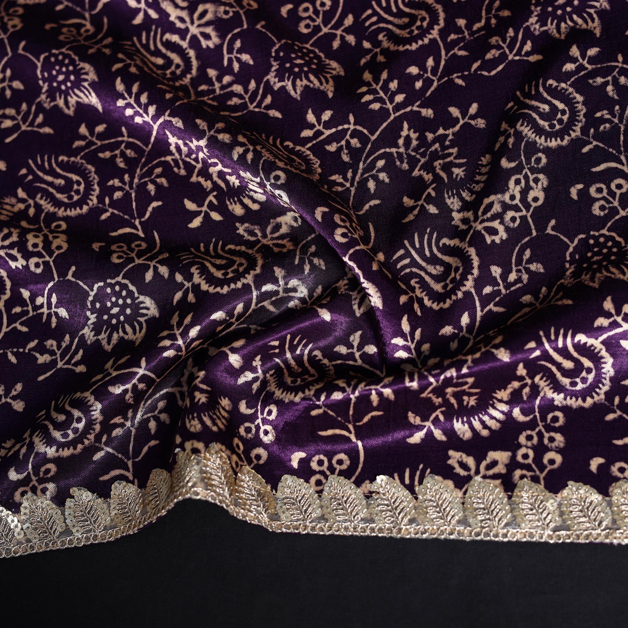 Purple lace work blouse piece created using hand block printing techniques, It features motifs inspired by the textile traditions of Gujarat’s Kutch region. Made from modal silk, known for its smooth texture and comfortable drape, it pairs well with a wide range of sarees. Easy to tailor in your preferred style, it’s a dependable choice for creating elegant and versatile blouse designs.