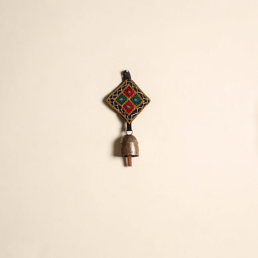 Copper-coated bell keychain. The art of making copper bells is practiced by the Luhar community (traditional ironsmiths) in the Kutch region of Gujarat. Scrap iron sheets are heated and hammered into shape, then coated with copper bits and fired in a furnace. Once cooled a wooden piece is attached inside the bell as a ringer, giving it its unique sound. The rugged, raw look of these finished bells feels truly nostalgic. What makes it even more special is the lovely, intricate Kutch embroidery on the cloth that adorns the bell, adding a touch of elegance and charm.