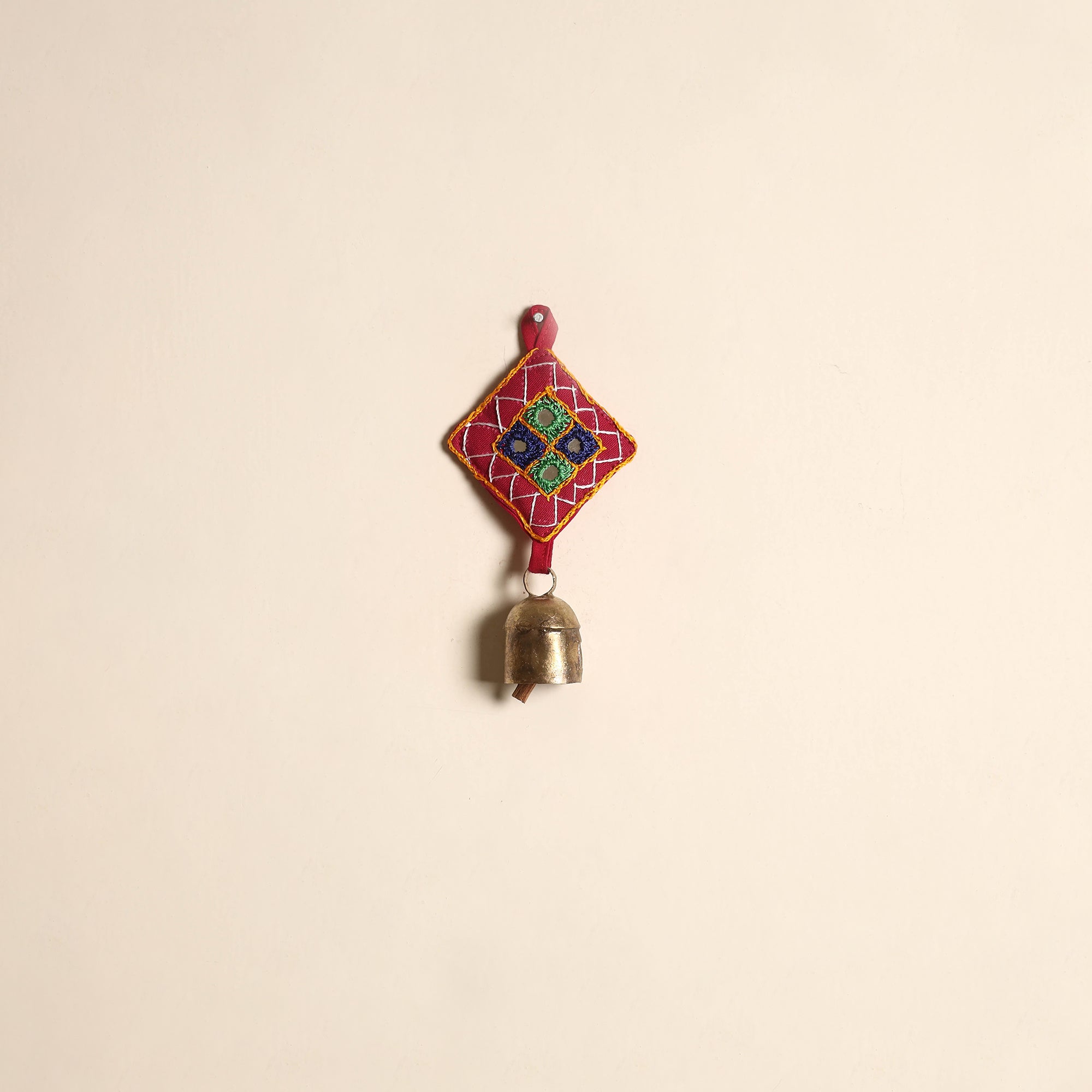 Copper-coated bell keychain. The art of making copper bells is practiced by the Luhar community (traditional ironsmiths) in the Kutch region of Gujarat. Scrap iron sheets are heated and hammered into shape, then coated with copper bits and fired in a furnace. Once cooled a wooden piece is attached inside the bell as a ringer, giving it its unique sound. The rugged, raw look of these finished bells feels truly nostalgic. What makes it even more special is the lovely, intricate Kutch embroidery on the cloth that adorns the bell, adding a touch of elegance and charm.