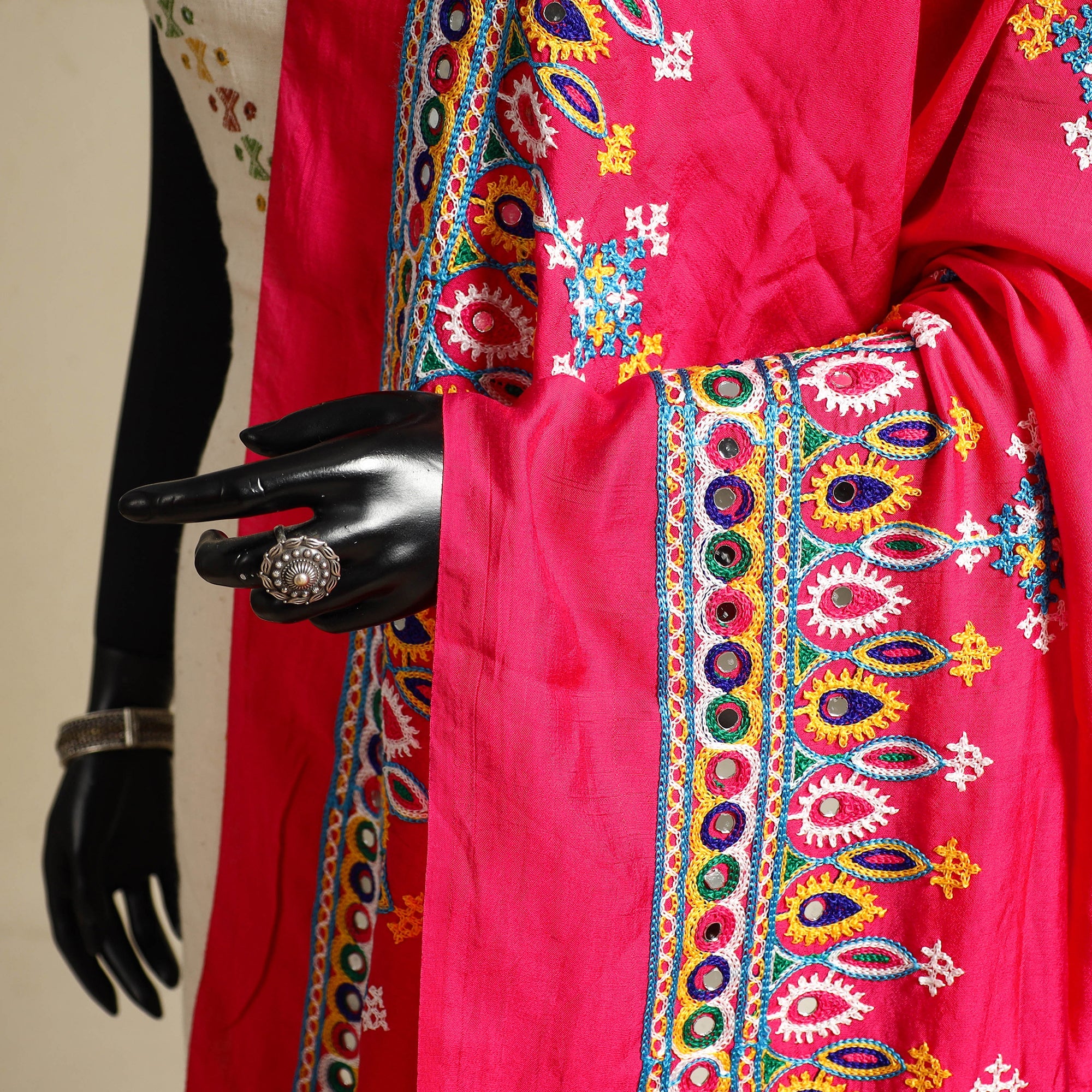Experience the charm of Kutch embroidery with this pink semi-modal silk handloom dupatta. Featuring intricate mirror work and highlighted with an elegant lagdi patta border, it reflects the artistry of skilled artisans. Dyed with natural colors, this dupatta beautifully blends cultural heritage with contemporary style, making it an ideal choice for festive gatherings as well as everyday traditional wear.