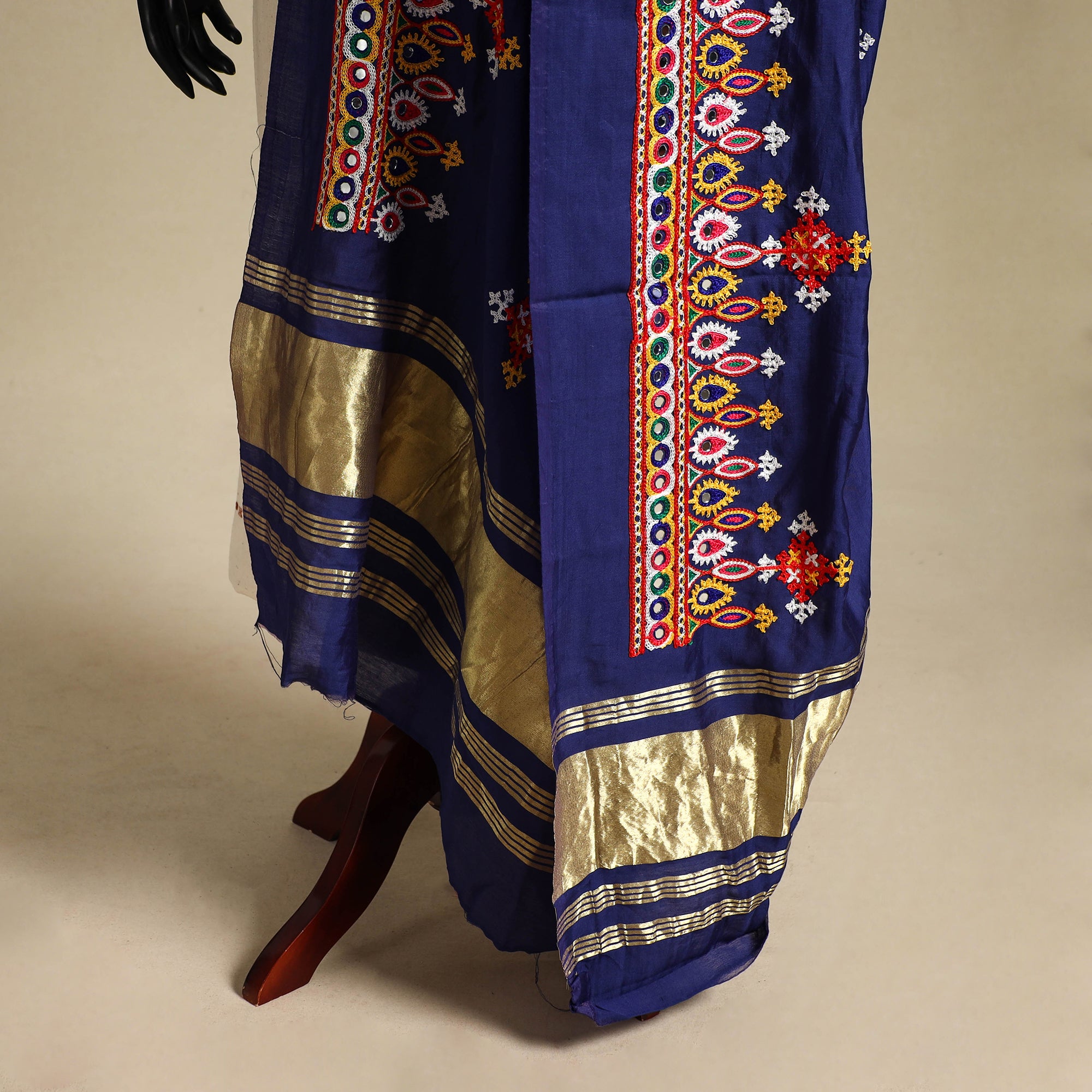 Experience the charm of Kutch embroidery with this blue semi-modal silk handloom dupatta. Featuring intricate mirror work and highlighted with an elegant lagdi patta border, it reflects the artistry of skilled artisans. Dyed with natural colors, this dupatta beautifully blends cultural heritage with contemporary style, making it an ideal choice for festive gatherings as well as everyday traditional wear.