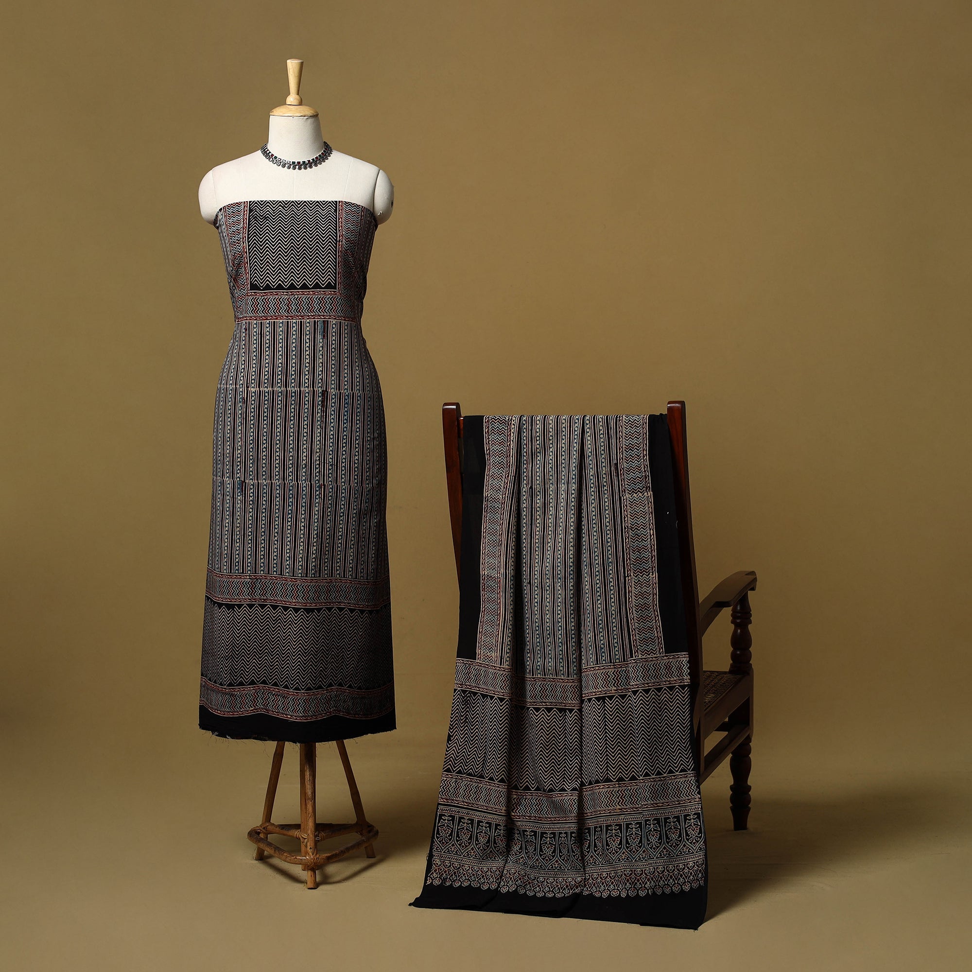 Hand block ajrakh print natural dyed cotton 2pc unstitched dress material from Kutch, Gujarat, created using traditional ajrakh printing techniques by artisan Tosif Khatri This textile tradition dates back over 4,500 years and is known for its intricate geometric patterns developed through multiple stages of printing and dyeing. The set includes kurta fabric and a matching dupatta, making it suitable for any occasions as well as for an elegant everyday ethnic look.