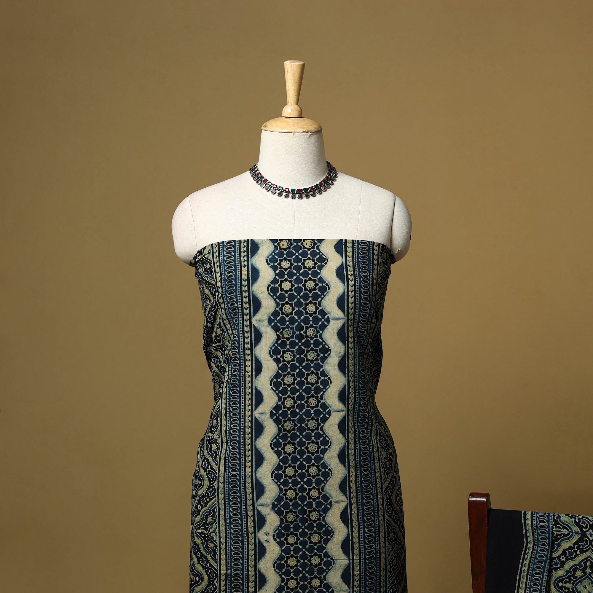 Hand block ajrakh print natural dyed cotton 2pc unstitched dress material from Kutch, Gujarat, created using traditional ajrakh printing techniques by artisan Tosif Khatri This textile tradition dates back over 4,500 years and is known for its intricate geometric patterns developed through multiple stages of printing and dyeing. The set includes kurta fabric and a matching dupatta, making it suitable for any occasions as well as for an elegant everyday ethnic look.