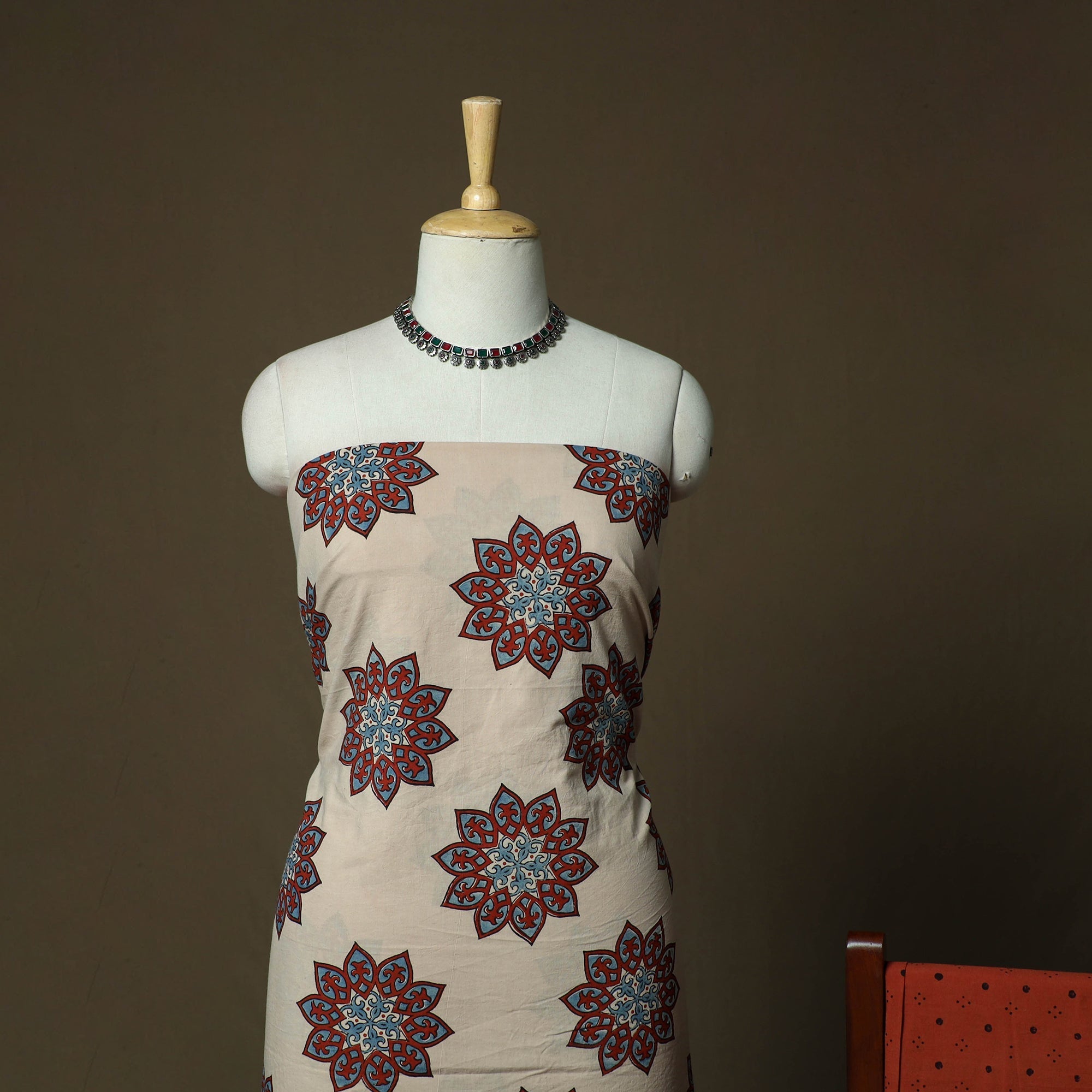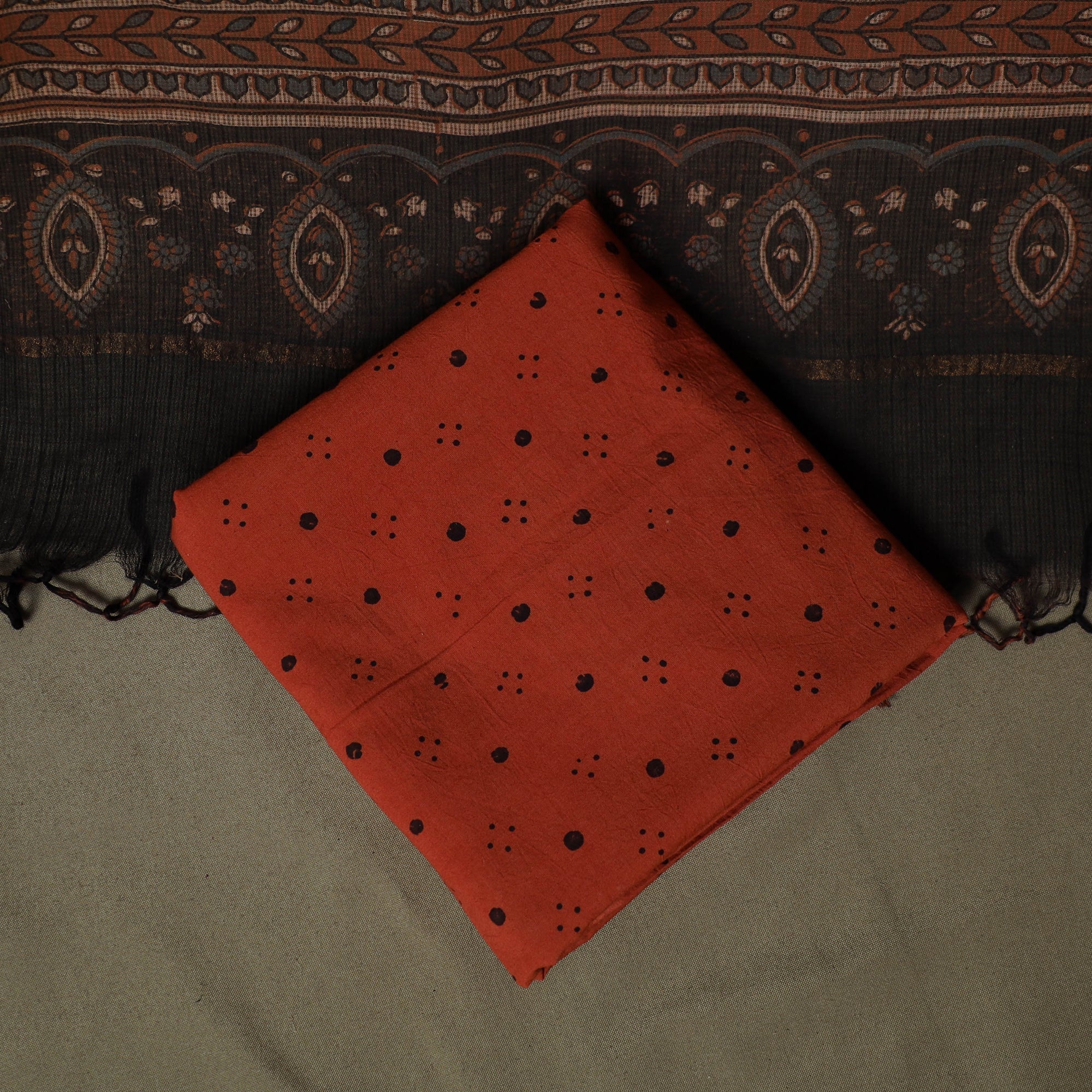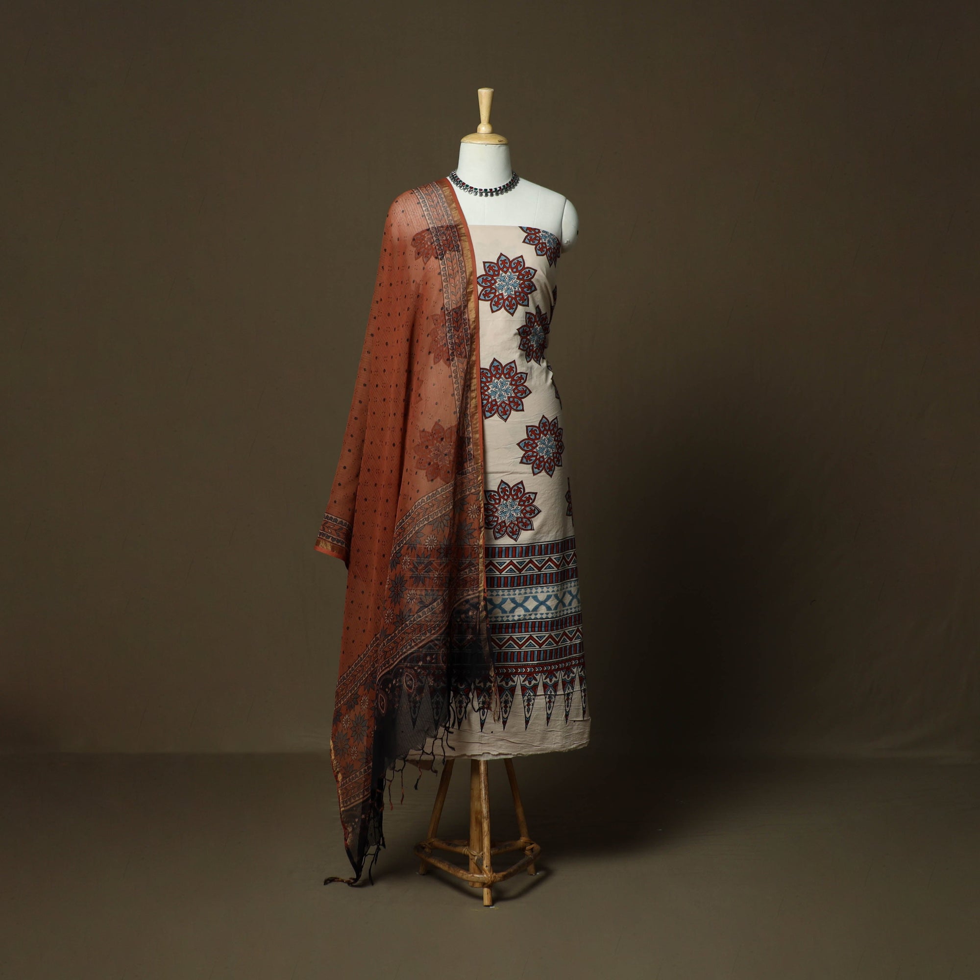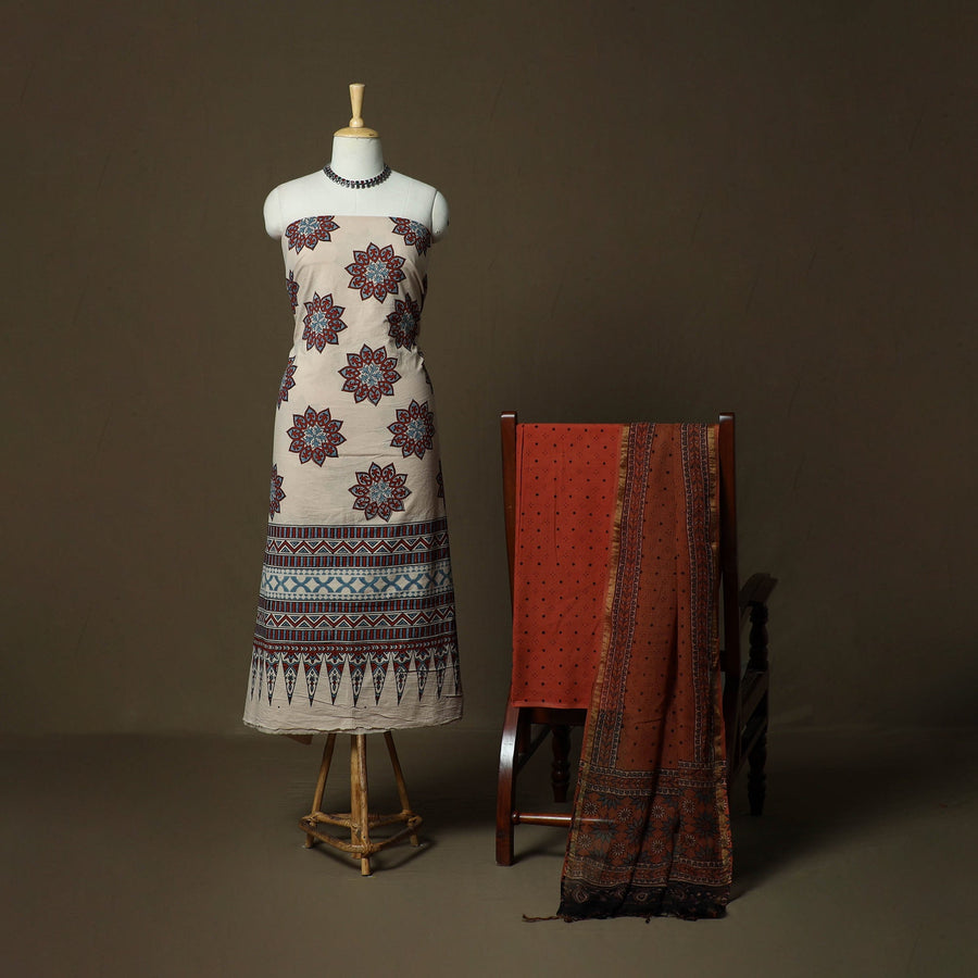 | Material | Beige hand block ajrakh print natural dyed cotton 3pc unstitched dress material from Kutch, Gujarat, created using traditional Ajrakh printing techniques practiced by artisan Jabbar Khatri. This craft is over 4,500 years old and is known for its detailed geometric patterns, developed through multiple dyeing and printing stages. This 3pc suit set includes cotton kurta fabric, a bottom fabric, and a kota doria dupatta. Kota doria is an age-old Indian textile produced in the Kota district of Rajasthan. The doria threads are finely interwoven to create distinctive check patterns. Its lightweight and sheer texture give it an exquisite grace and elegance of its own, making it perfect for special occasions or creating an elegant ethnic look. |