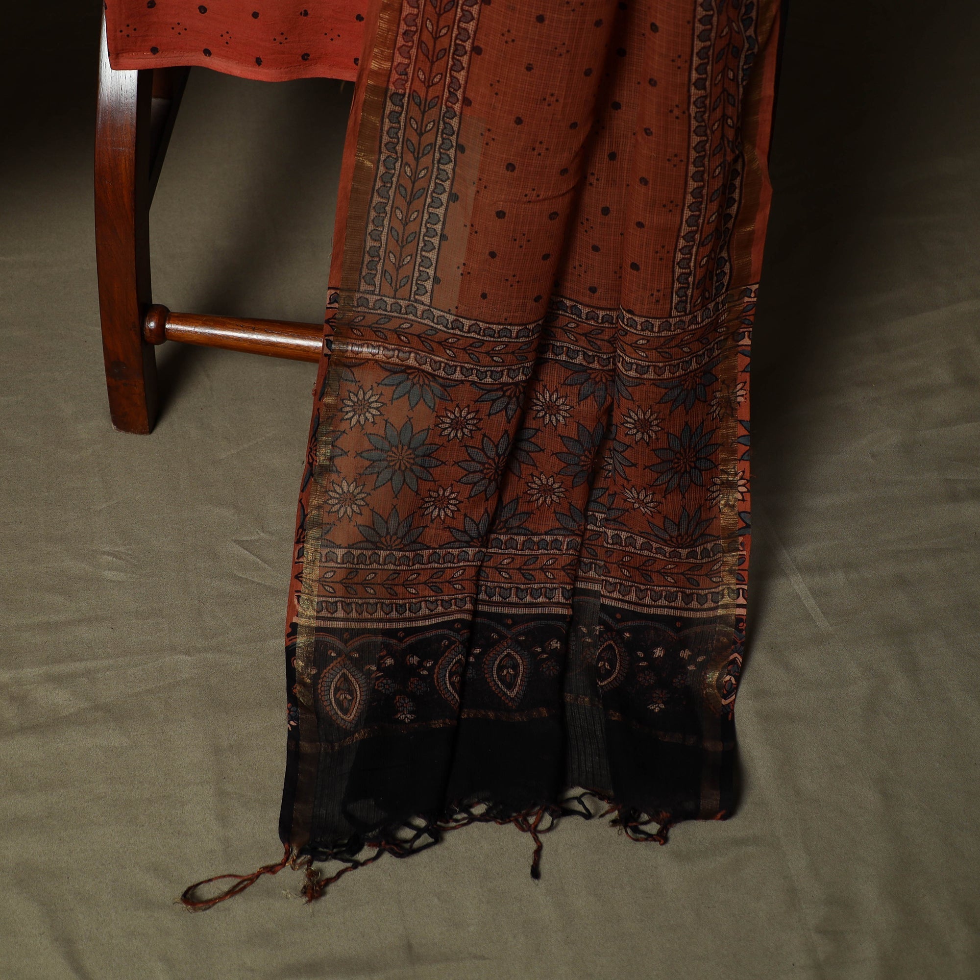 Ajrakh is a well-known traditional vegetable dyeing that resists block-printing techniques on cloth. Originated in Kutch, It is nearly around 4,500 years old practised by Khatri community of Kutch and Sikh.