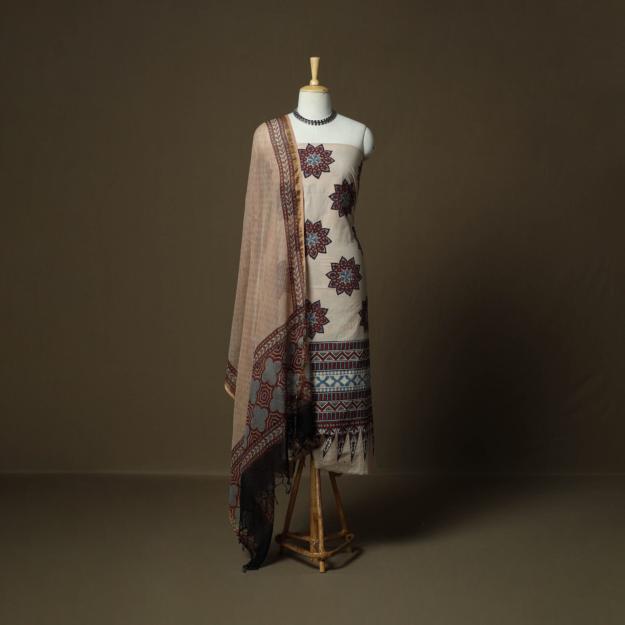 | Material | Beige hand block ajrakh print natural dyed cotton 3pc unstitched dress material from Kutch, Gujarat, created using traditional Ajrakh printing techniques practiced by artisan Jabbar Khatri. This craft is over 4,500 years old and is known for its detailed geometric patterns, developed through multiple dyeing and printing stages. This 3pc suit set includes cotton kurta fabric, a bottom fabric, and a kota doria dupatta. Kota doria is an age-old Indian textile produced in the Kota district of Rajasthan. The doria threads are finely interwoven to create distinctive check patterns. Its lightweight and sheer texture give it an exquisite grace and elegance of its own, making it perfect for special occasions or creating an elegant ethnic look. |